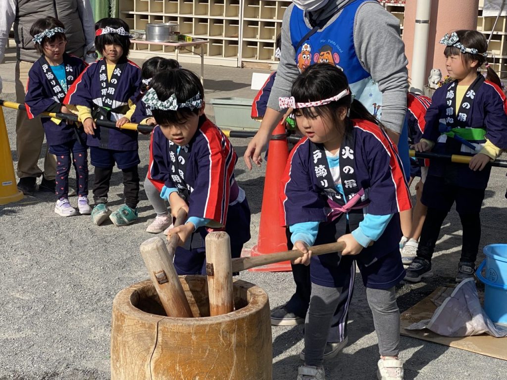 年長は新年の準備をするため、法被を着て日本の伝統行事(餅つき)を体験しました。「ぺったんたんおいしくなーれ」周りで見学している他学年のお友達が応援してくれます。もち米を食べて、普通の米との違いを感じました。鏡餅にして幼稚園に飾りましょう! -