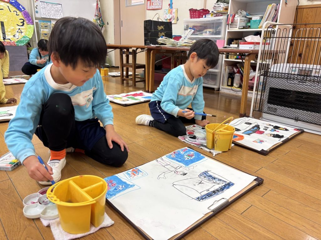 年長ふじ組の絵画「将来の夢」では、警察官や電車の運転士、水族館や動物園の飼育員さん、アイドルなど大きくなった自分を想像しながら画用紙いっぱいに描きました。絵の具の濃さや水分量の調節なども上手になりましたね。混色を楽しんでいる子もいます。 -