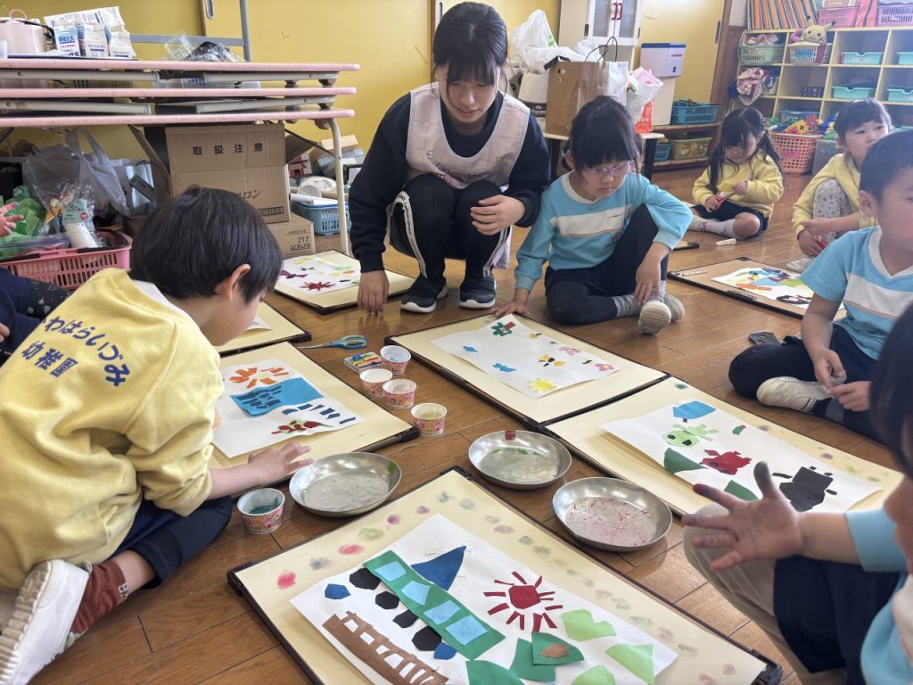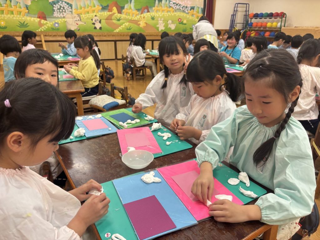 すみれ組は、色画用紙でいろいろな形を切って貼りました。これは何に見えるかな…家やロボット、お花畑に変身しました。ハサミの扱い方もになって、細かい作業もできるようになりましたね。ばら組は、版画で自分の顔を表現。可愛い顔、カッコいい自分が完成... -