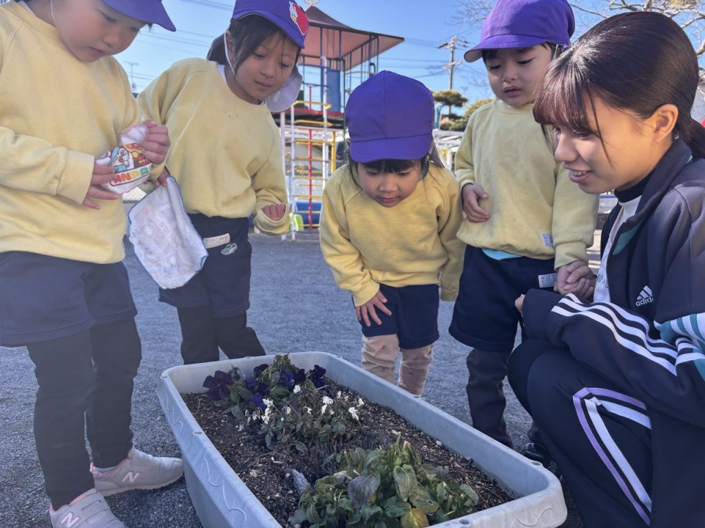 静岡にも雪が降り、子どもたちは大興奮で、雪の思い出を次々と話してくれました。幼稚園ではプールやバケツの水が凍ったり、花壇やプランターには霜柱ができたり…冬の自然をたっぷり感じることができました。外の水道は水が出なかったです。 -