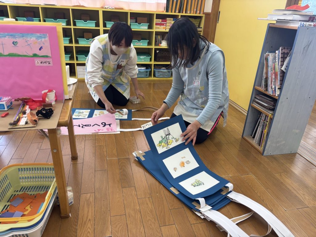 先生たちはみんなが帰った後、絵を飾ったり作品を並べたり、明日の準備をしています。どういう配置にしたら子どもたちの作品がきれいに見えるか、何度も試したり工夫したりしながら進めていきます。作品に名前とコメントを書いて、最終チェックです… -