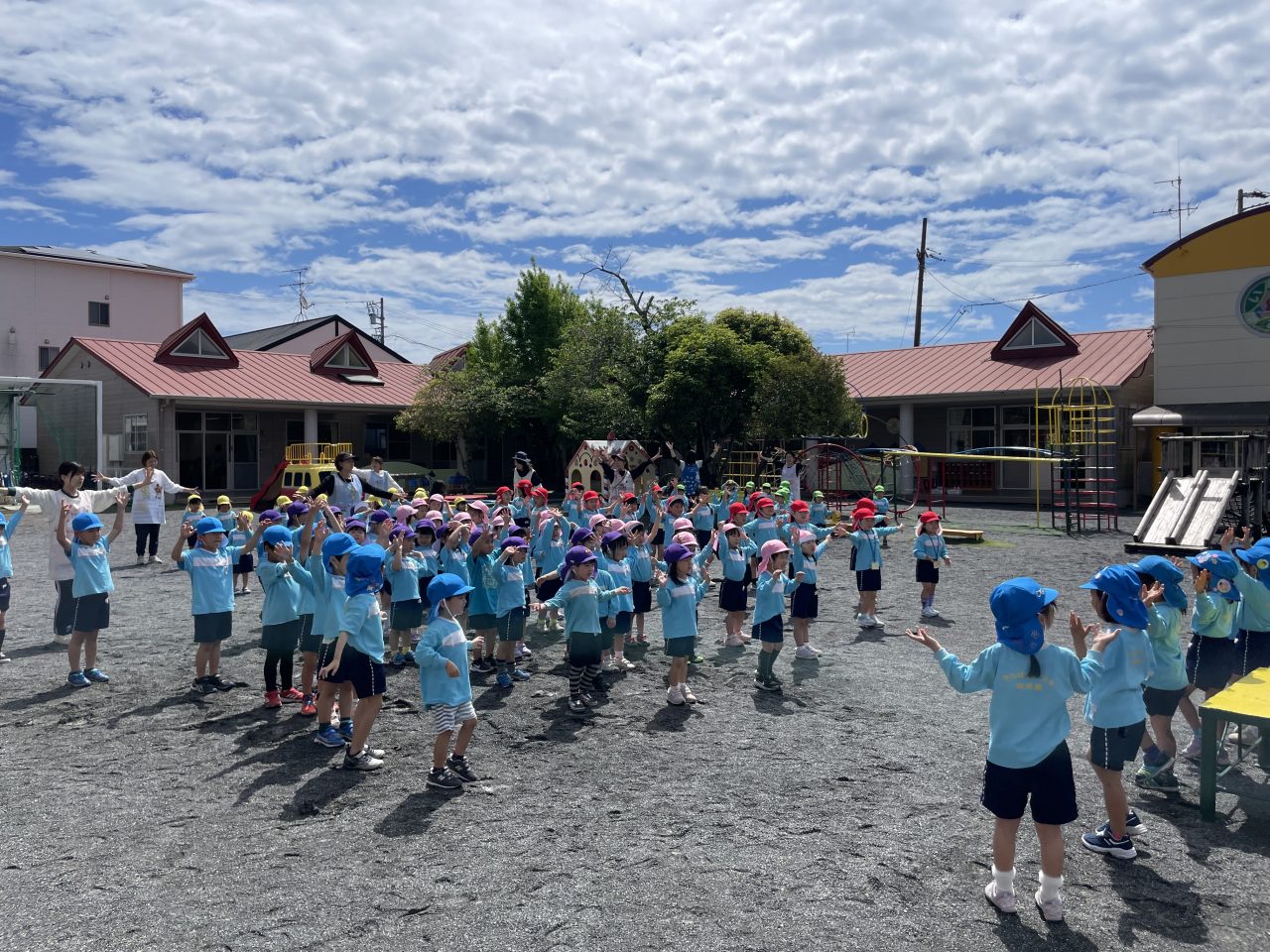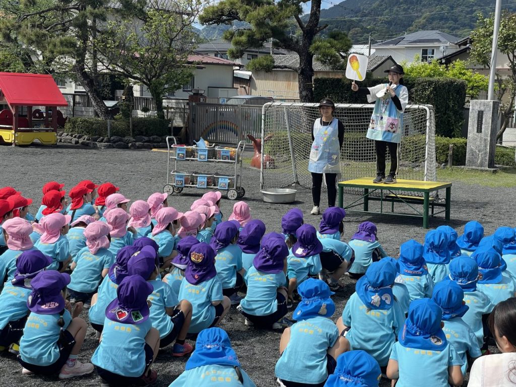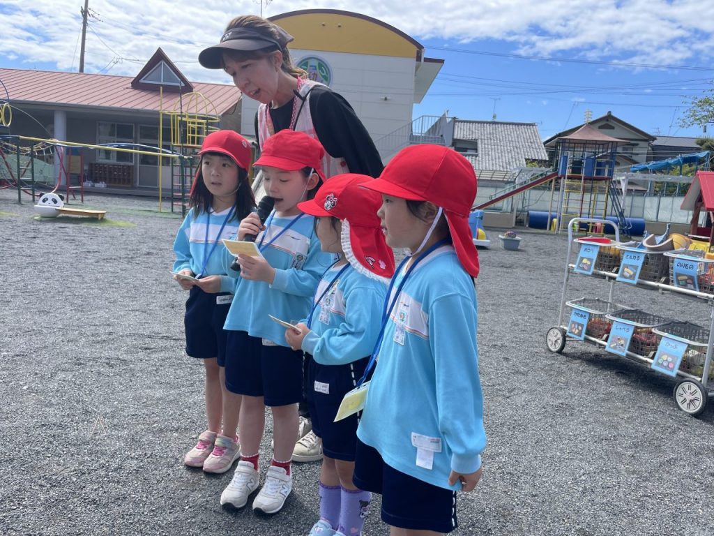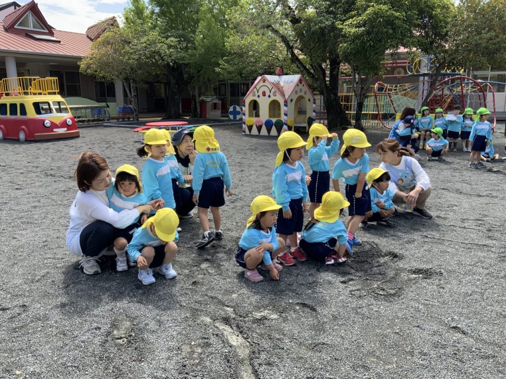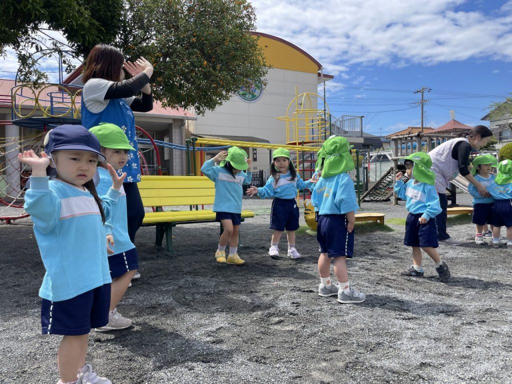 毎週月曜日は園長先生の話を聞いたり、歌や体操をしたりする全体集会があります。司会をしてくれる年長のお兄さんお姉さんの姿がたくましく見えました。みんなの大好きなサンサン体操の曲が流れると、元気いっぱい身体を動かしていました。 誰でも通園制度ばなな ドッジボール対決