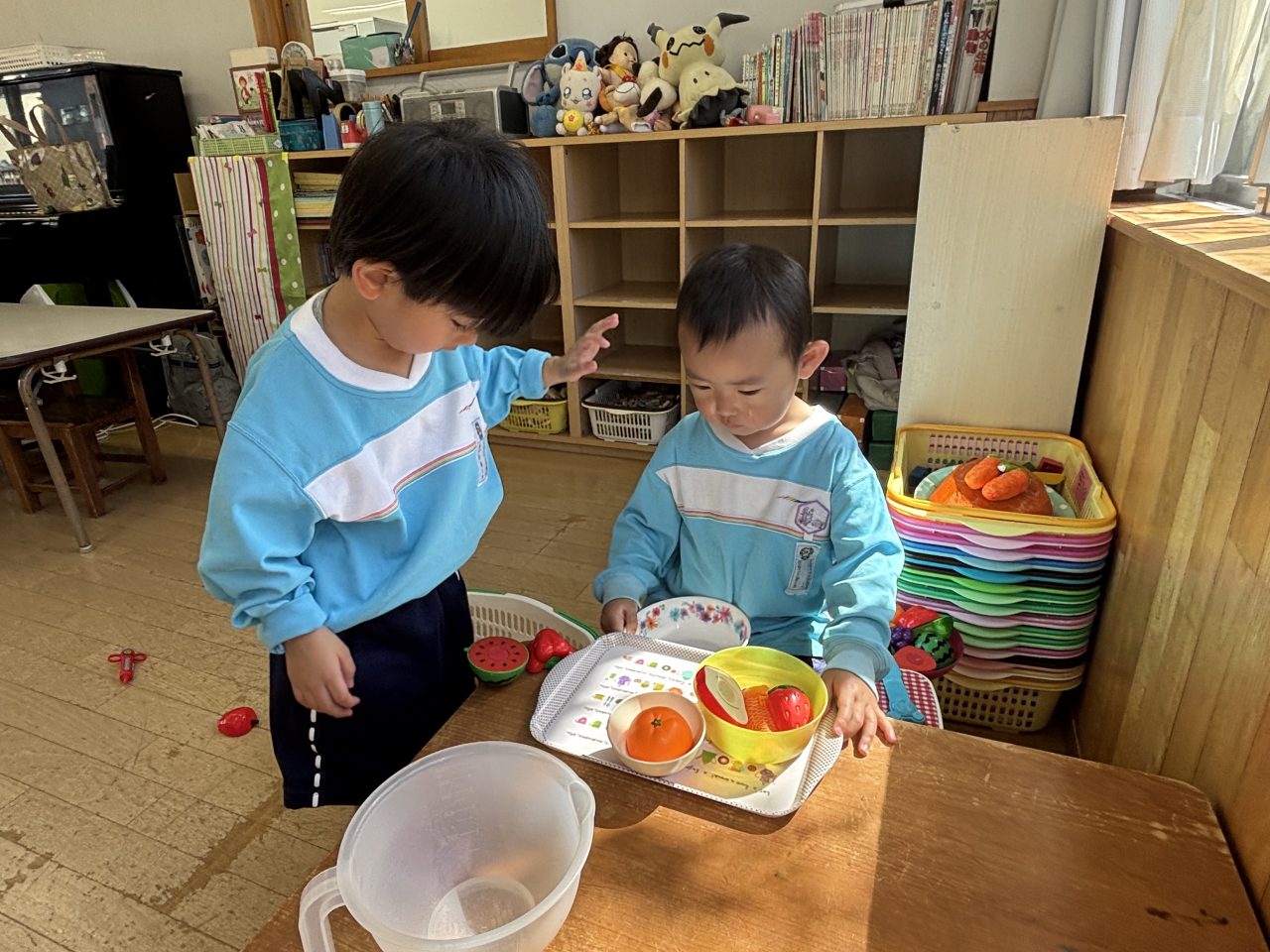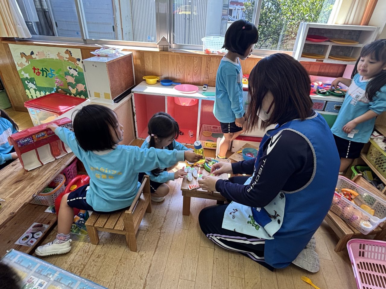 これまでの生活の経験を、遊びに発展させる子どもたち。お皿に寿司を乗せ、回転寿司ごっこを楽しみました。ジュースはいかがですか?支払いはPayPayでお願いしまーす。明日はどんな楽しいことが待ってるかな。 園庭あそび 誰でも通園制度ばなな