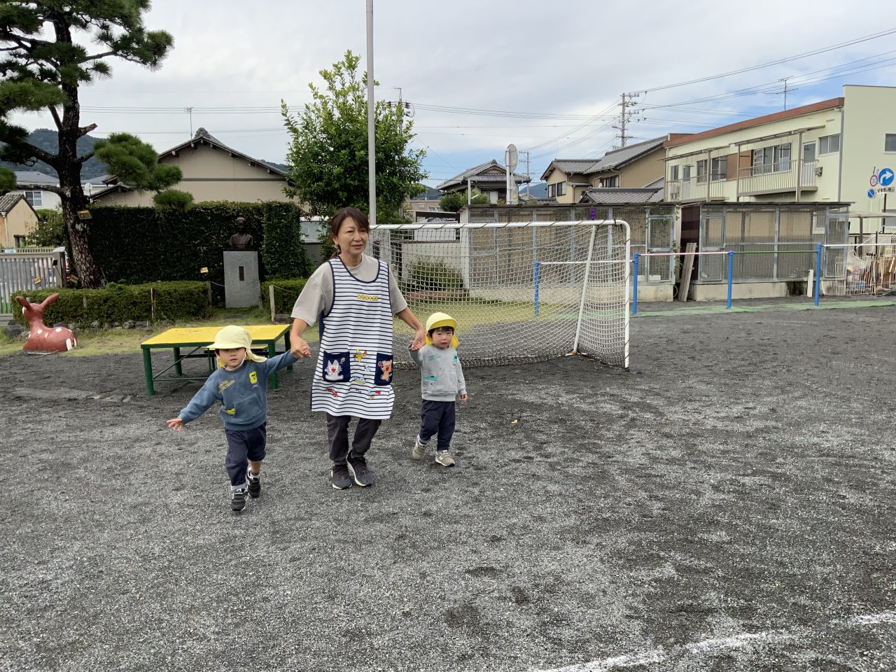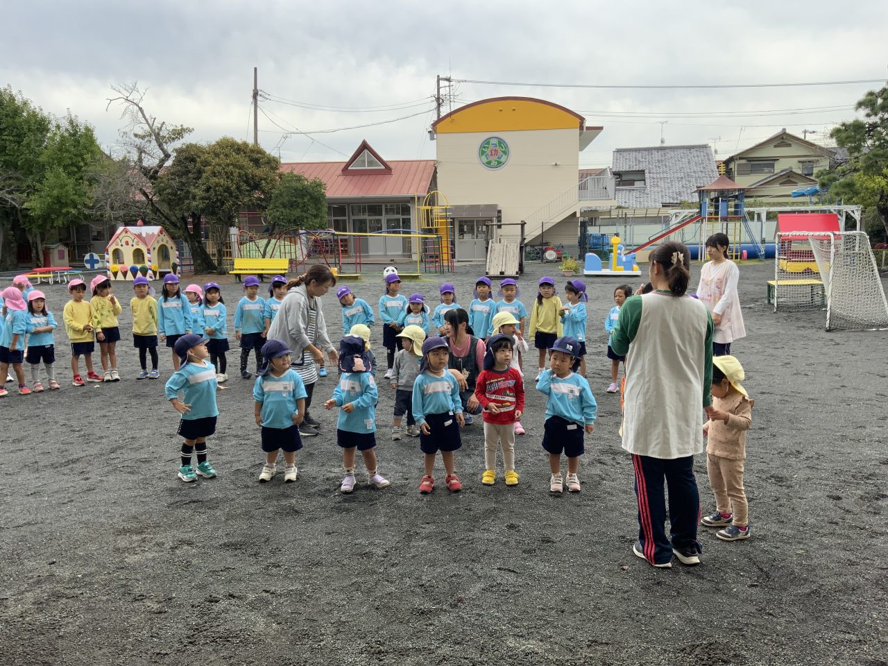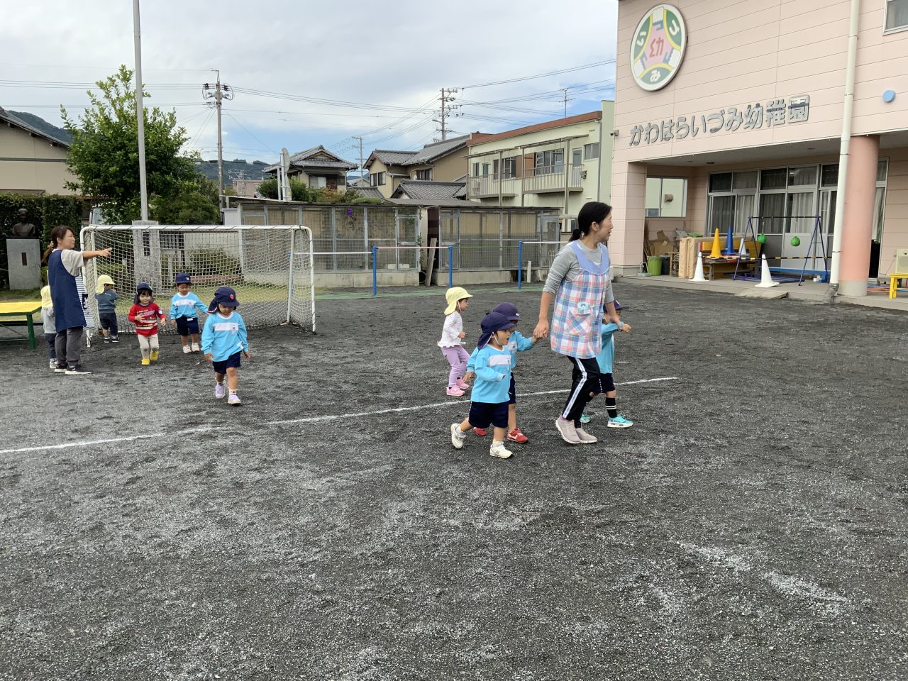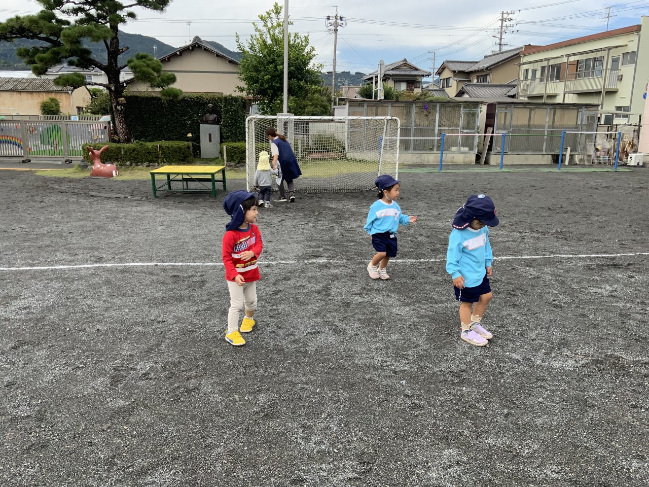 満3歳児りす組、今年度入園児こりす、来年度入園児ばなな…みんな揃って運動会が始まりました。お兄さん、お姉さんのまねっこをして準備体操をします。先生と手を繋いで、よーいドンのかけっこも上手にできましたね!