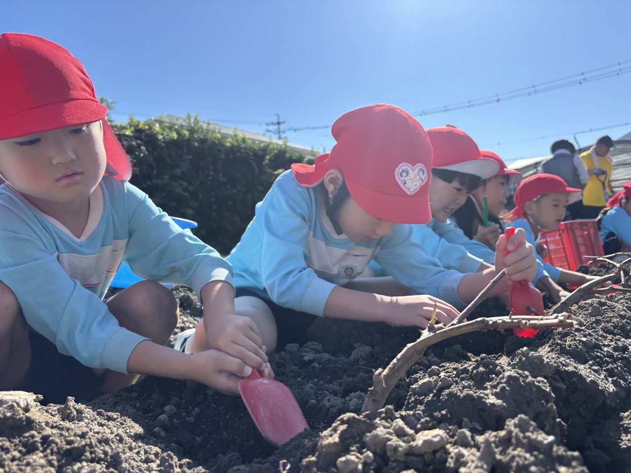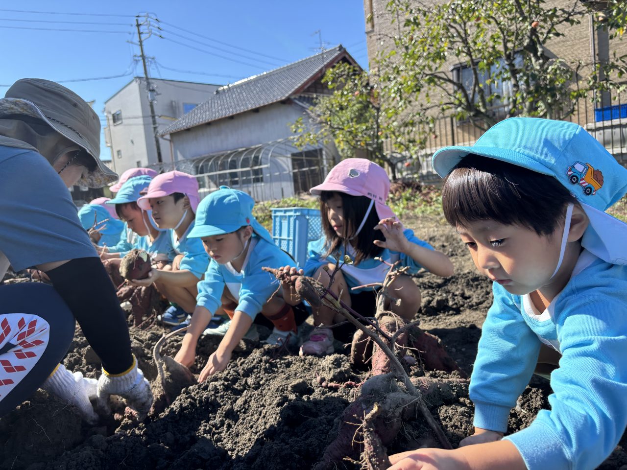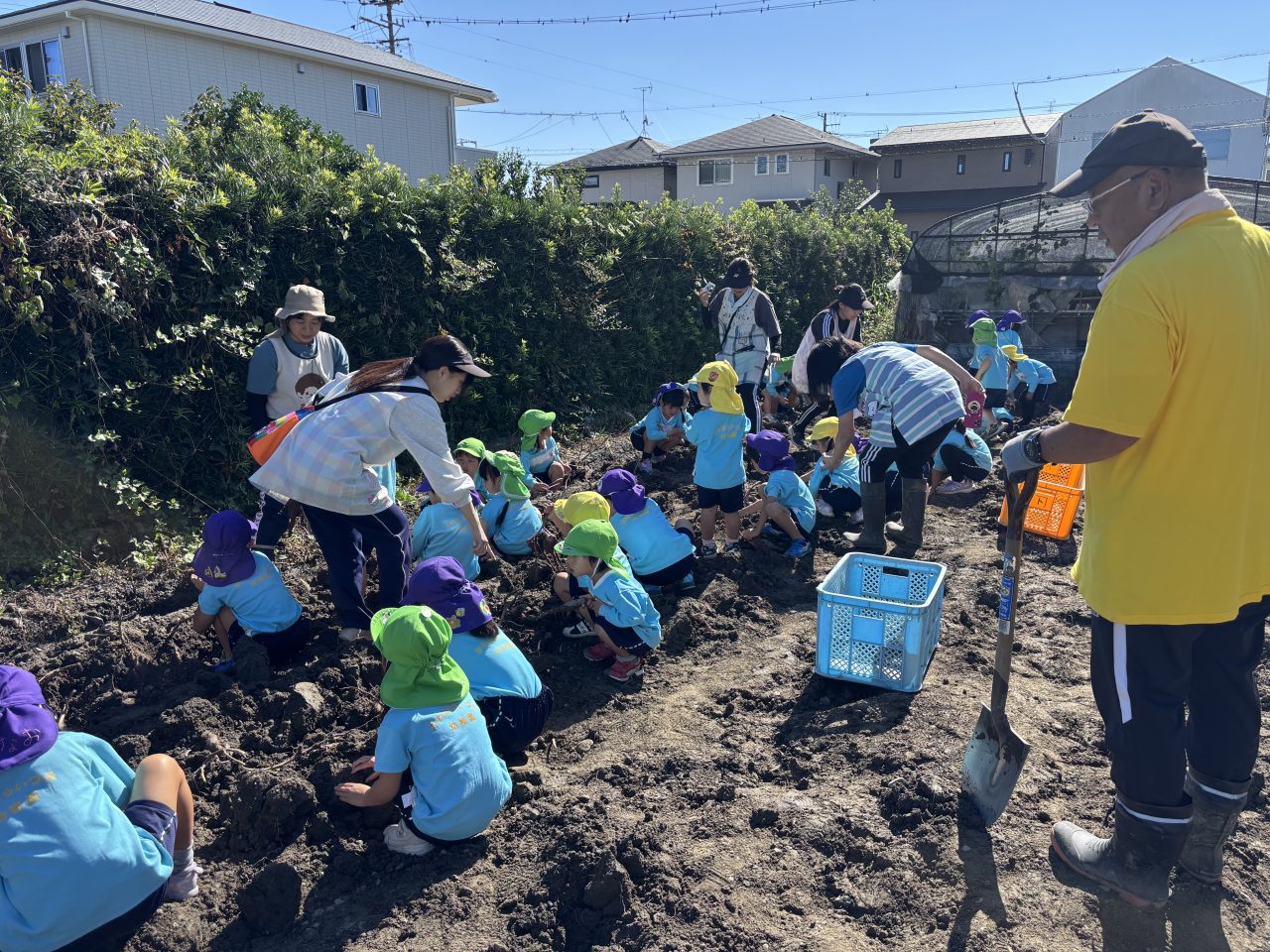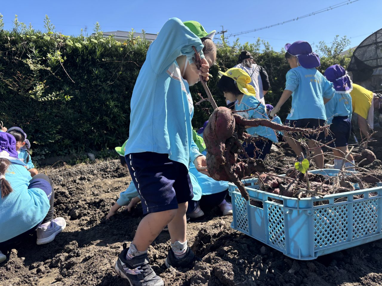 幼稚園の畑で育てたサツマイモ、今年の収穫は…241キロ!!ここ数年で1番の大収穫です。実が大きく成長し、両手でやっと持てるくらいの大きいものもたくさんです。「うんとこしょ、どっこいしょ」と歌を口ずさみながら芋掘りを楽しむ子どもたちでした。 シュートチャレンジ 焼きいもパーティー