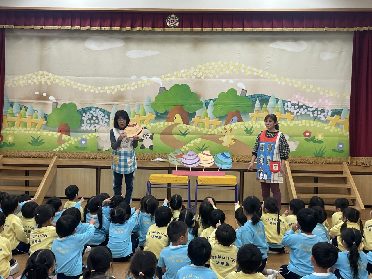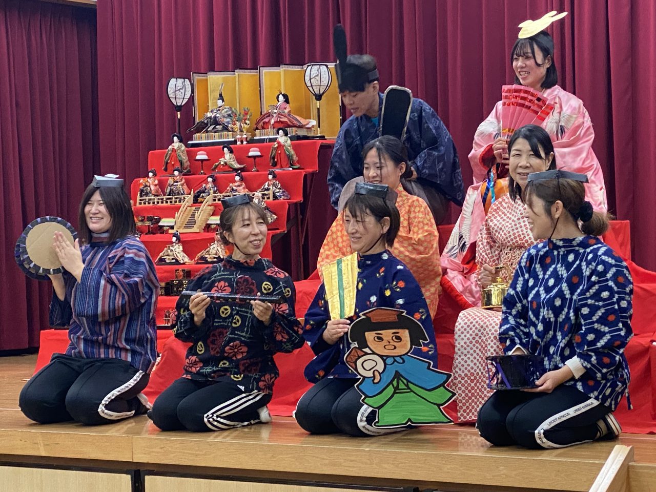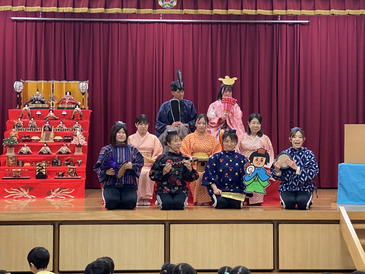 今日の主役は、女の子!先生たちの劇では、一年ぶりに段ボールから出してもらったお人形さんたちが、主人公の健やかな成長と幸せを願いました。給食では、ひな祭りのお麩や三色ゼリーを食べお祝いです。お雛様とても綺麗でしたね… パワフルキッズ 卒園式練習