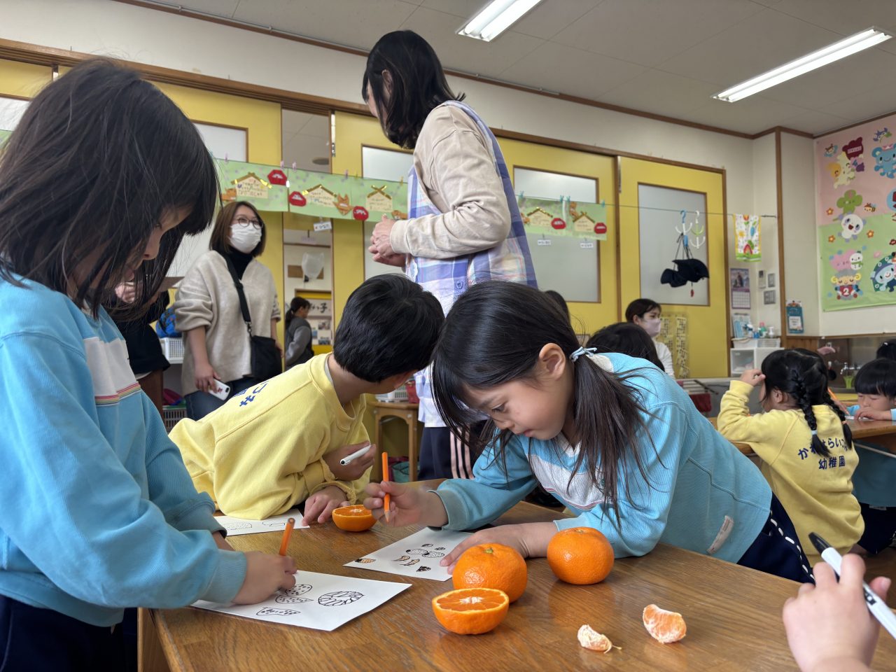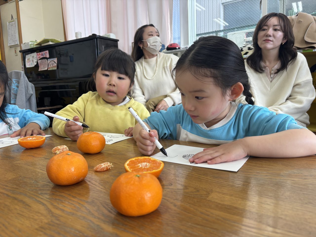 年中参観会は「よく見て描こう」と言う題で、みかんを描きました。細かい筋やツルツルした皮まで表現できて、美味しそうなみかんが完成!そのあとはいただきま〜す、甘くて美味しかったね。