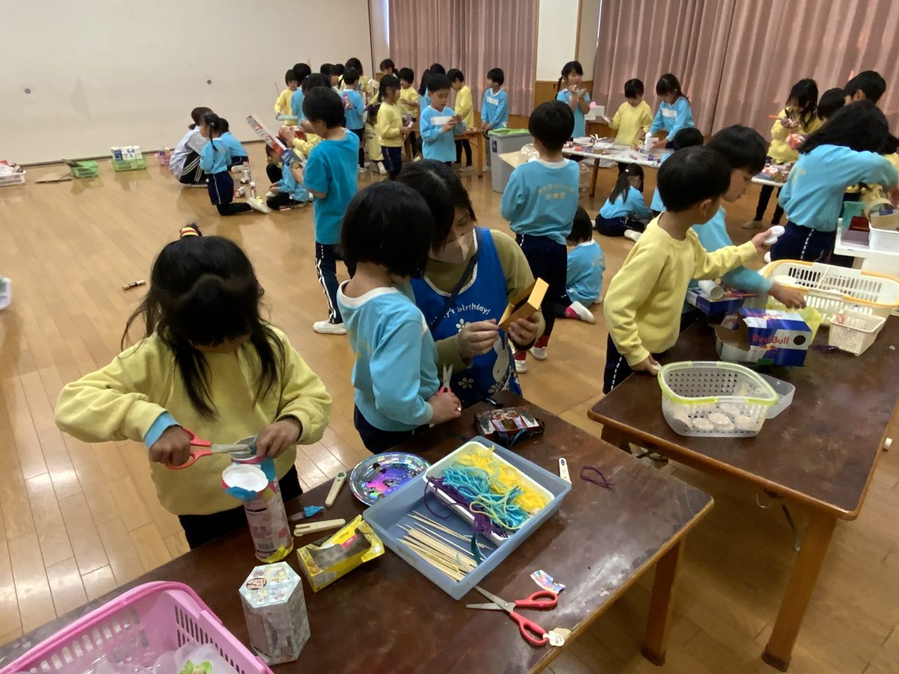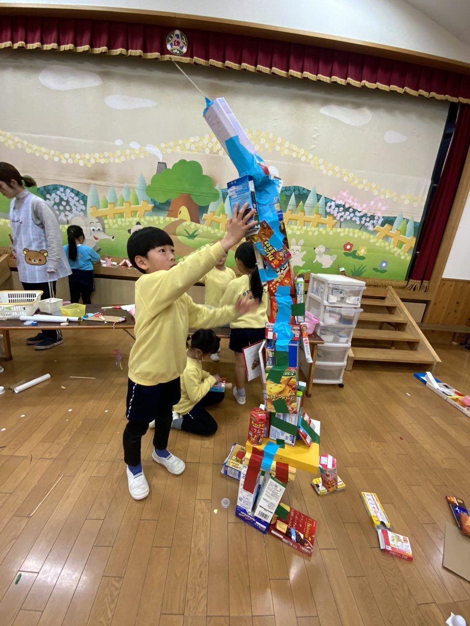お菓子の箱や廃材をたくさん持ち寄って、想像したモノを形に。ロボットやお家、乗り物や動物など…テープやボンドを使って好きなように組み合わせていきました。より大きくかっこよく工夫して、それぞれ素敵な作品と造形物が出来上がりました。 給食参観会 公園清掃
