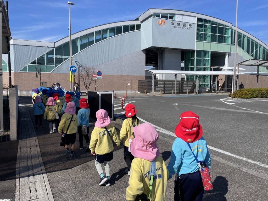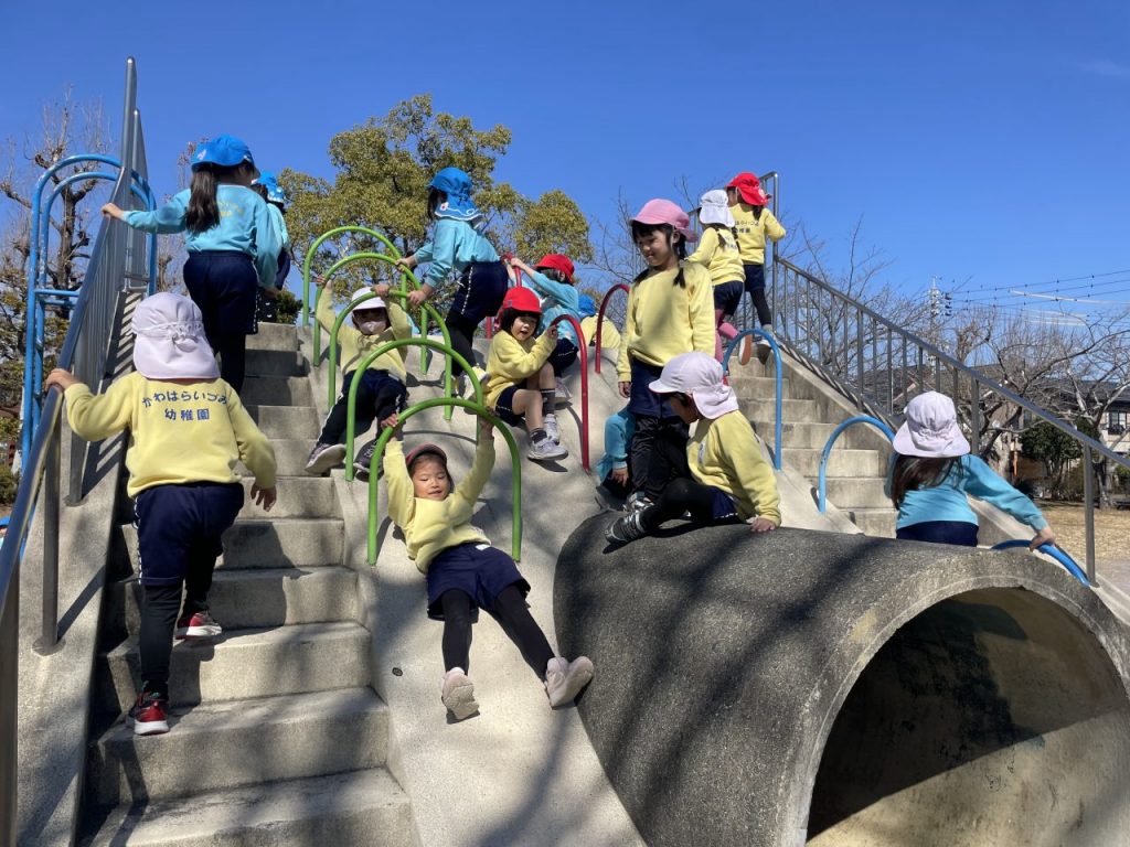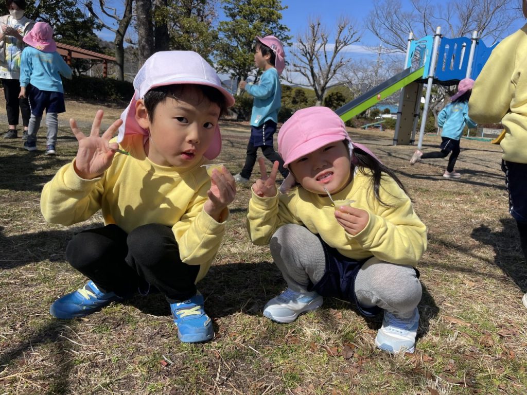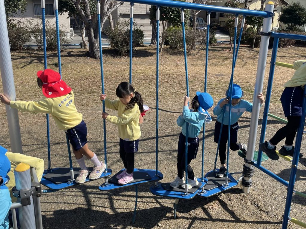 年長・中で広野公園に行きました。園から公園まで少し距離がありましたが、電車を見たり友だちとお話をしたり、楽しく歩くことができました。公園では、増やし鬼や大きな遊具でたくさん身体を動かし、卒園前の年長さんと楽しい思い出を作れてよかったです。 しっぽ取りゲーム 年少キラピカGO!