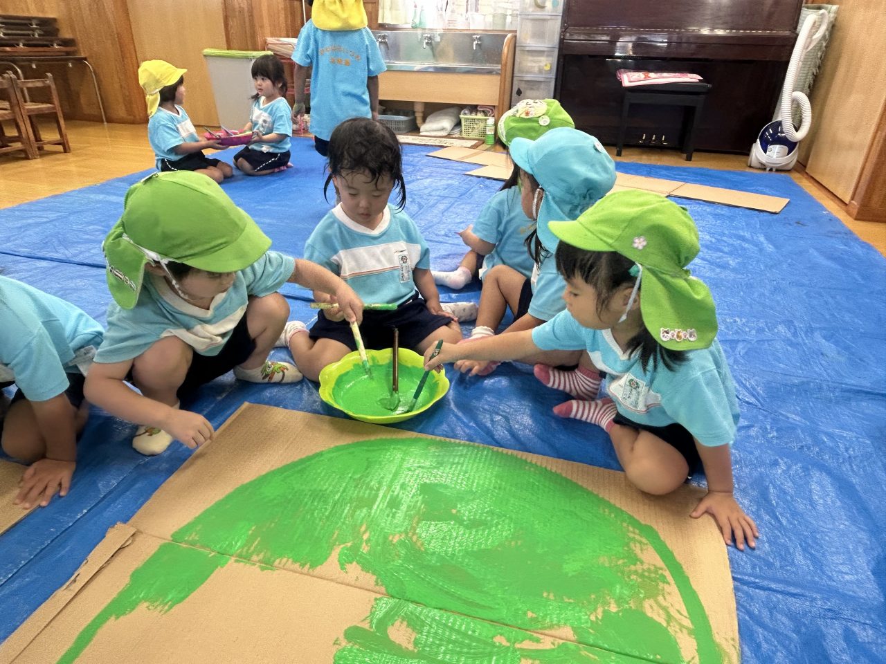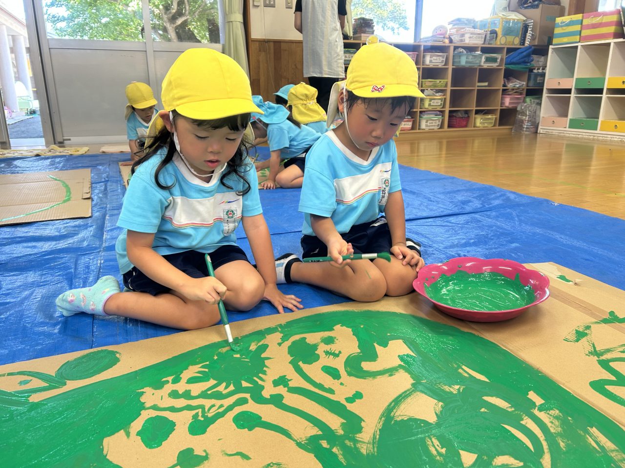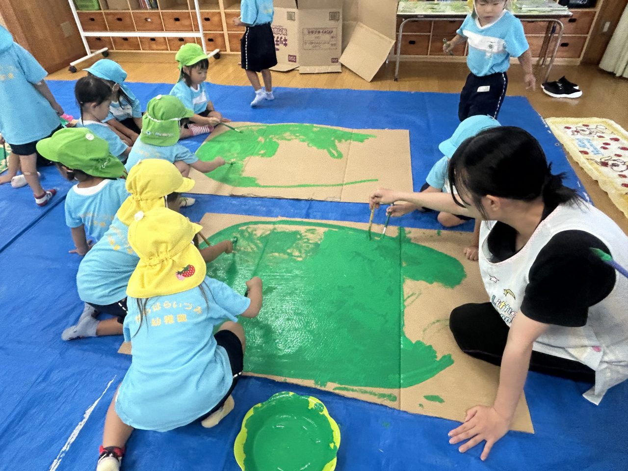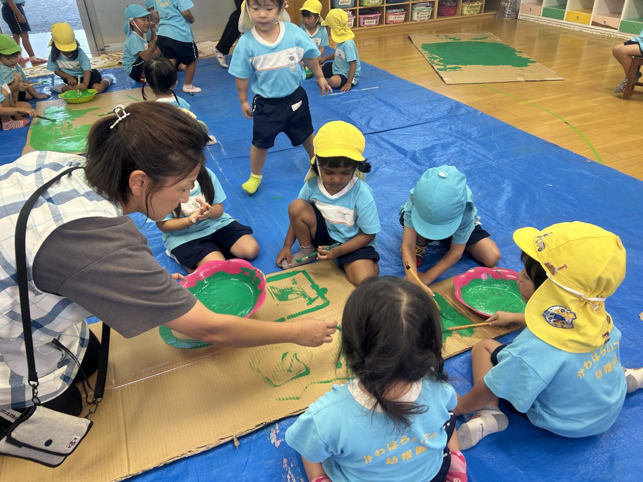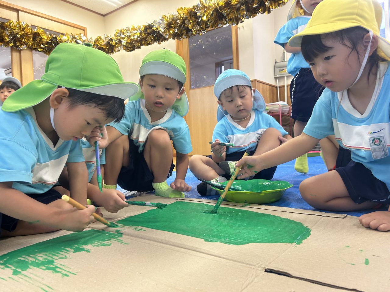 運動会の個人競技で使用する道具を、自分たちで作っている最中です…絵の具ぬりぬり。。。大きなサボテンが出来上がりました!本番はこのサボテンさんとハイタッチして競争を楽しみます。どんなレースになるかドキドキですね かけっこよーいドン! 入場行進