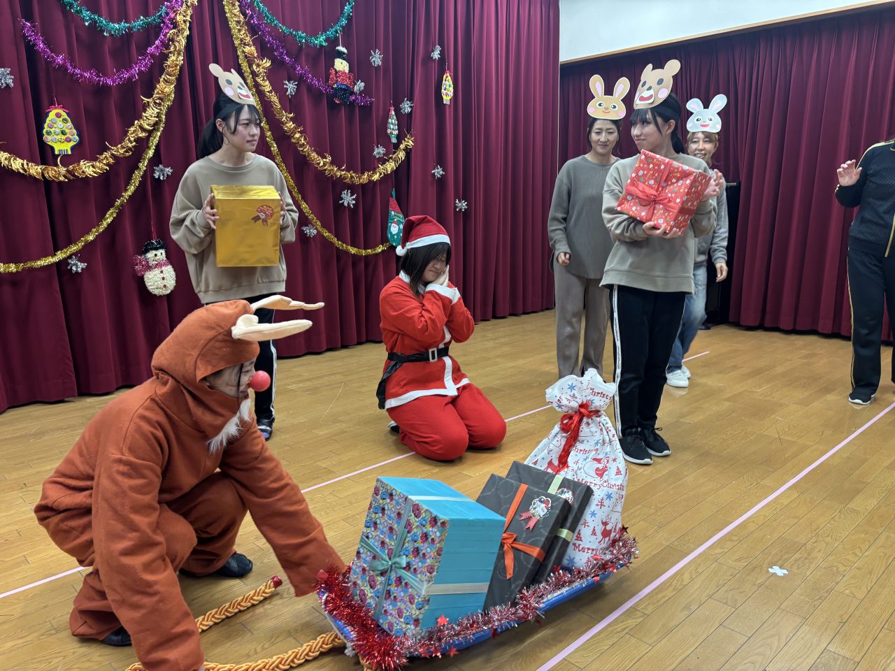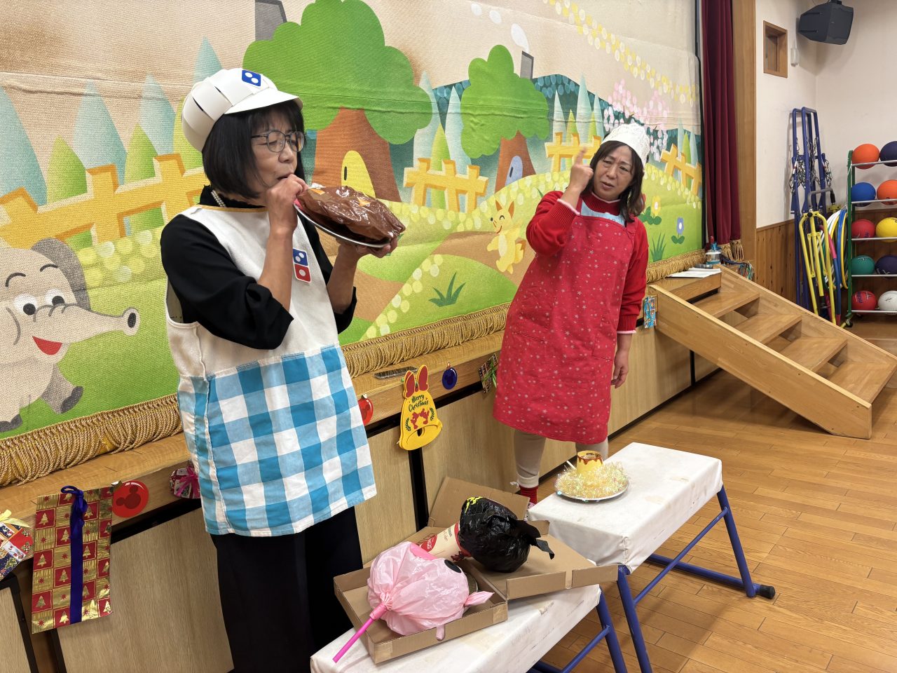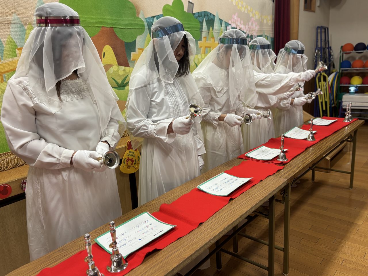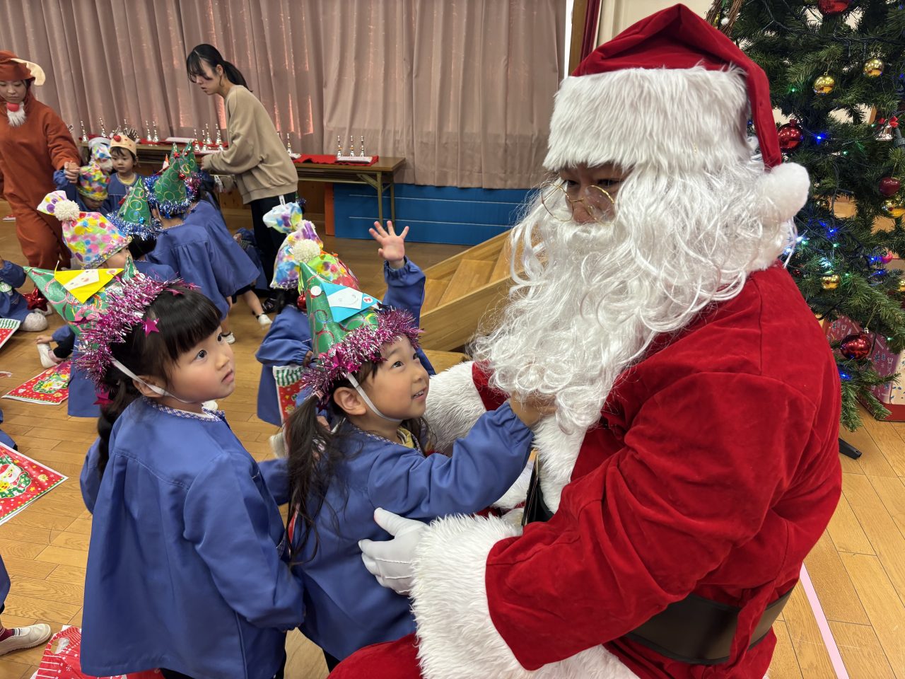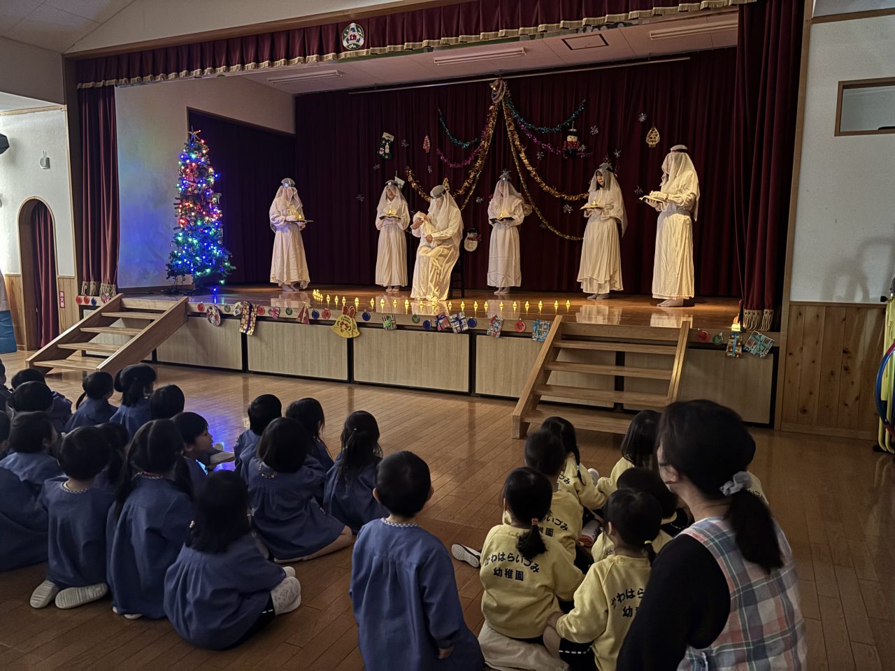 幼稚園は幻想的な雰囲気に包まれました…天使のページェントやベル演奏、先生たちの劇や手品など、楽しいことが盛りだくさんのクリスマス会。「かわはらいづみ幼稚園のみんなはとても良い子です。」サンタさんに願いが通じてプレゼントを持ってきてくれました! ケーキパーティー 授業で来園