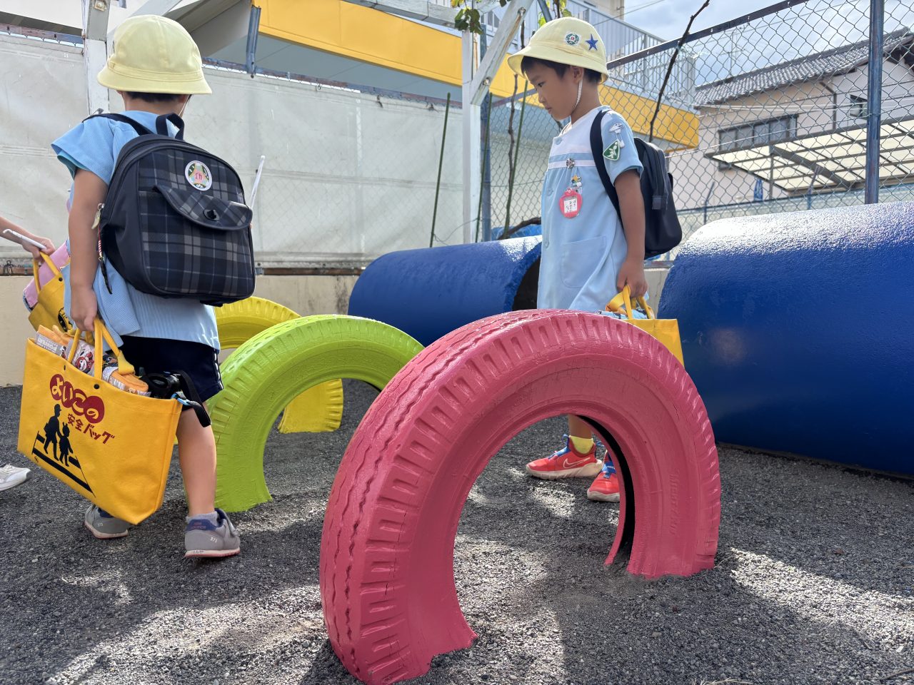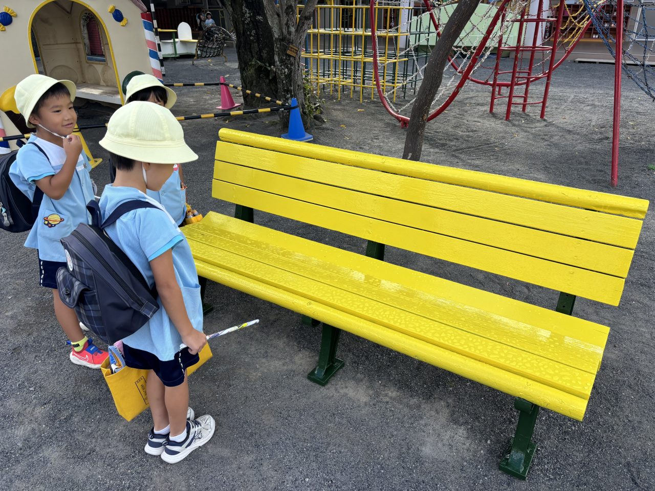 園庭にある土管やタイヤなど、一部ペンキが剥がれていた遊具を専門業者さんが綺麗に塗り直してくれました。登園するとピカピカになっているベンチに気づいた子どもたち…他にも色が変わっている遊具はないかと、園庭中を探しました。 入場行進 チャレンジレース