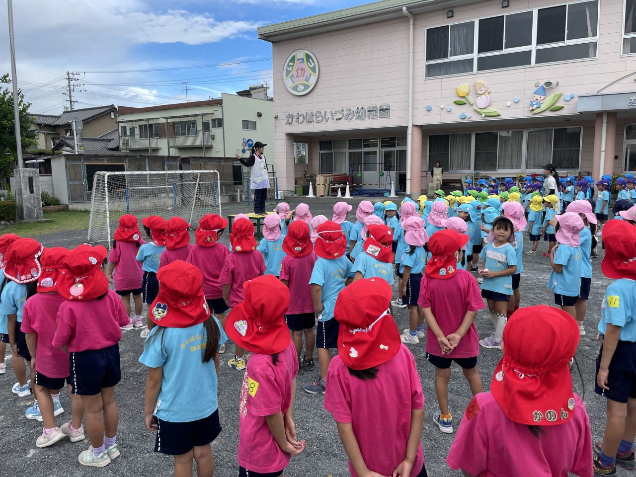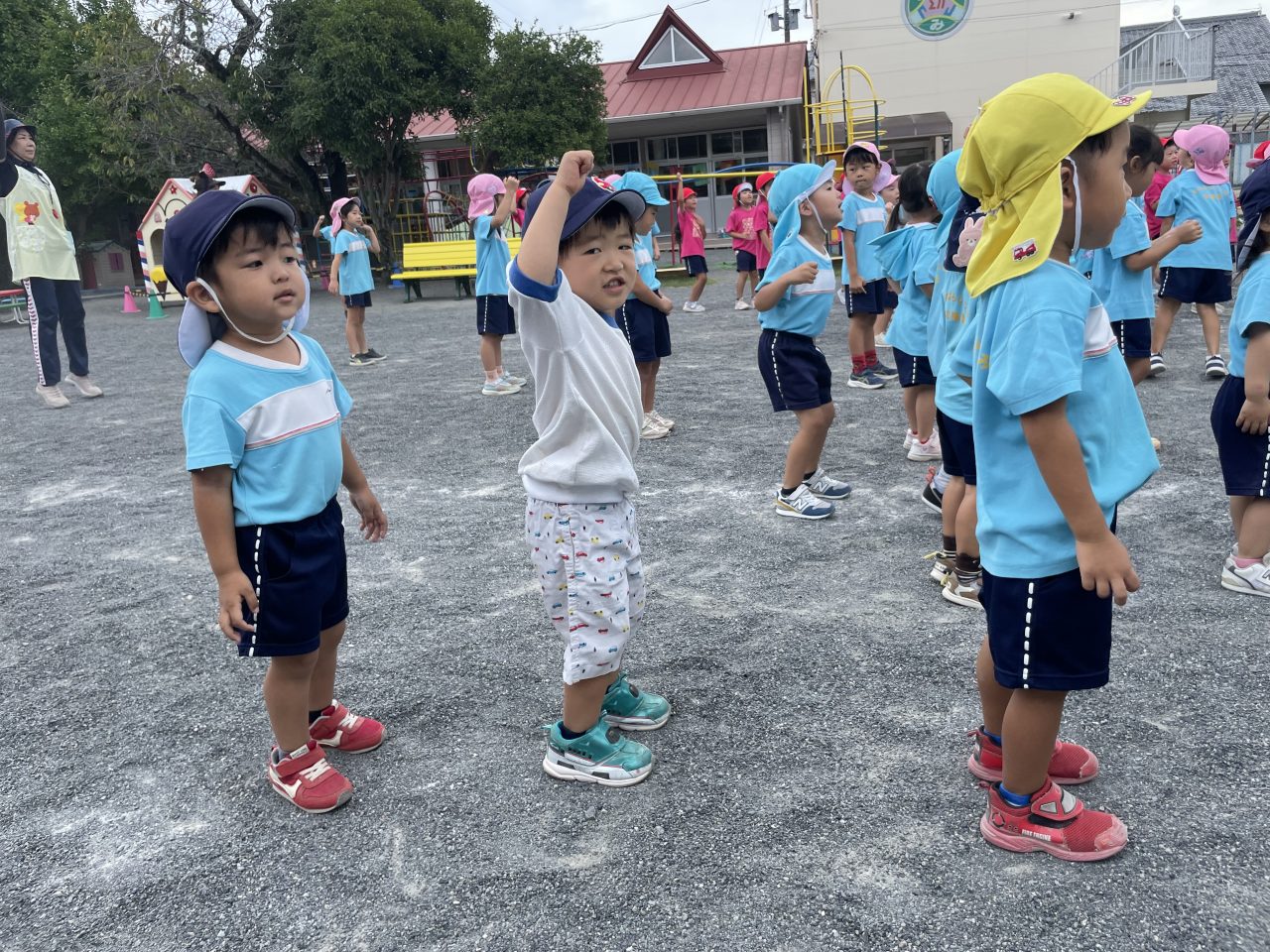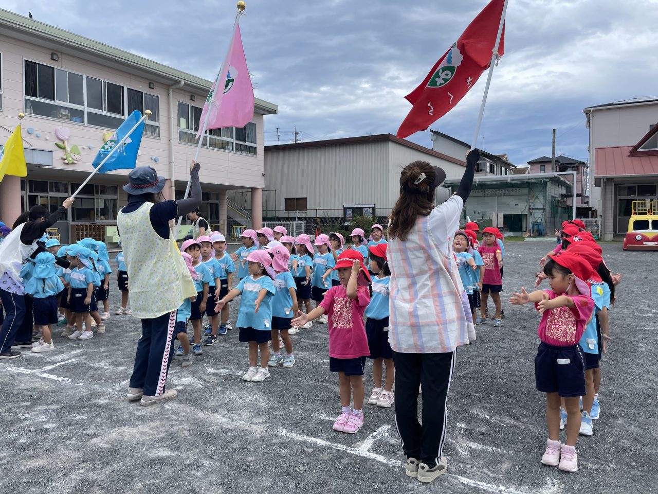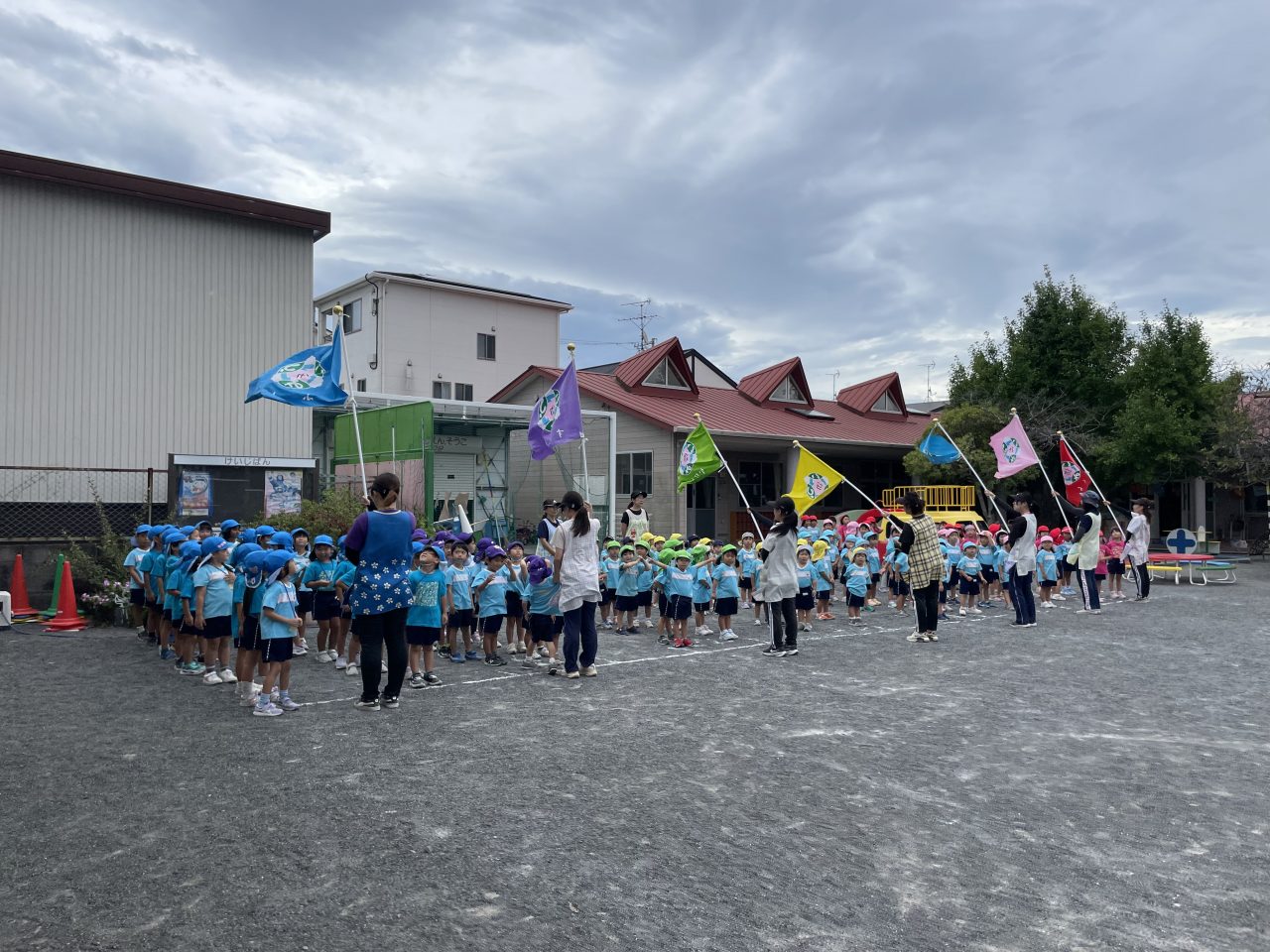運動会の始まりは、先生たちがクラスカラーの旗を持ち、その後ろを子どもたちが元気に行進します。手と足を思いきり振って、いちに、いちに!おひさまパワーに負けないよう、元気に準備体操をしましょう。満3歳児クラスのお友達も頑張っていますね。 サボテン作り ペンキ塗りでピカピカ