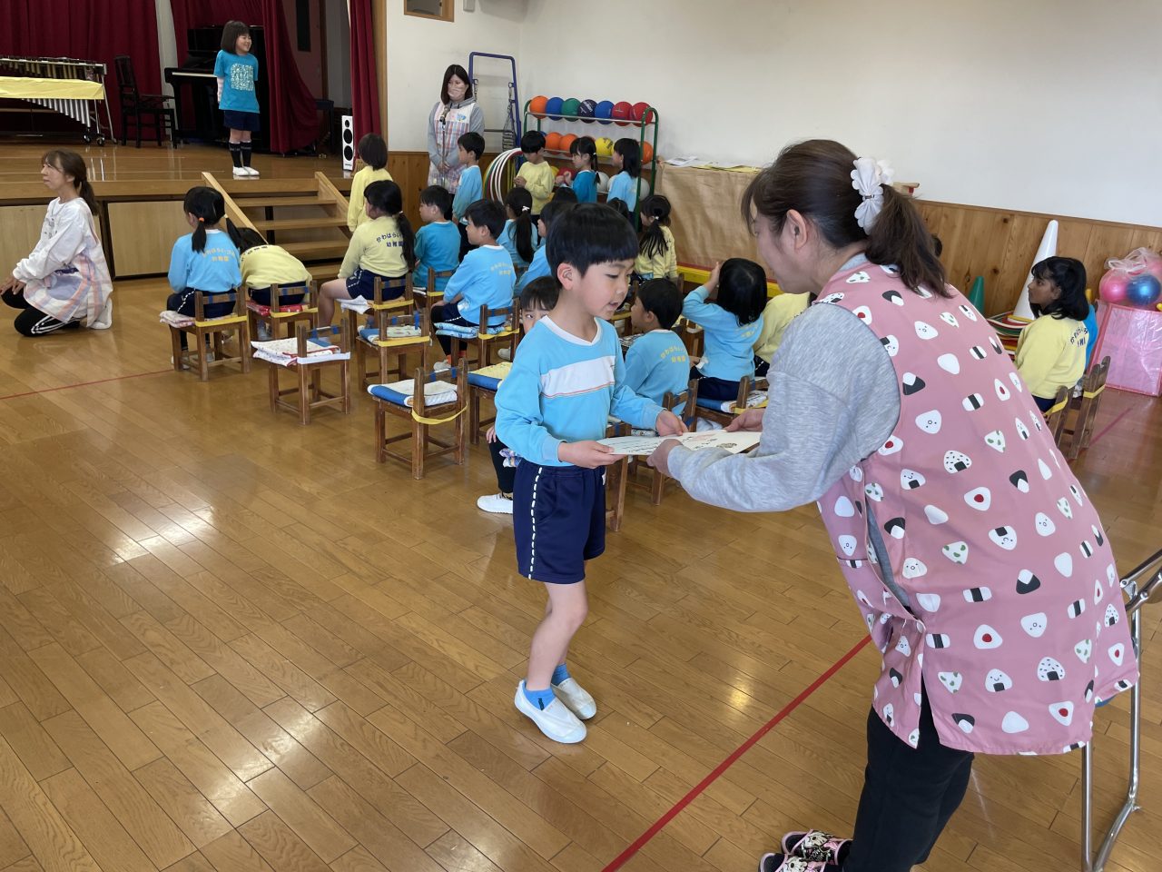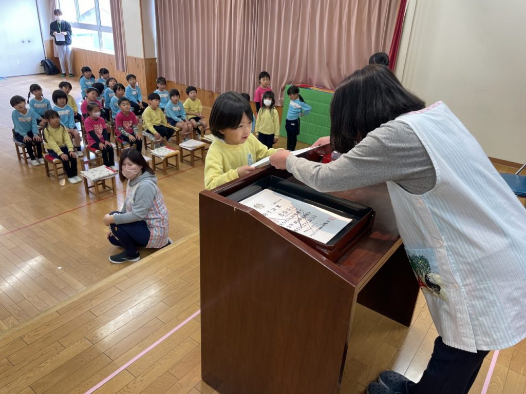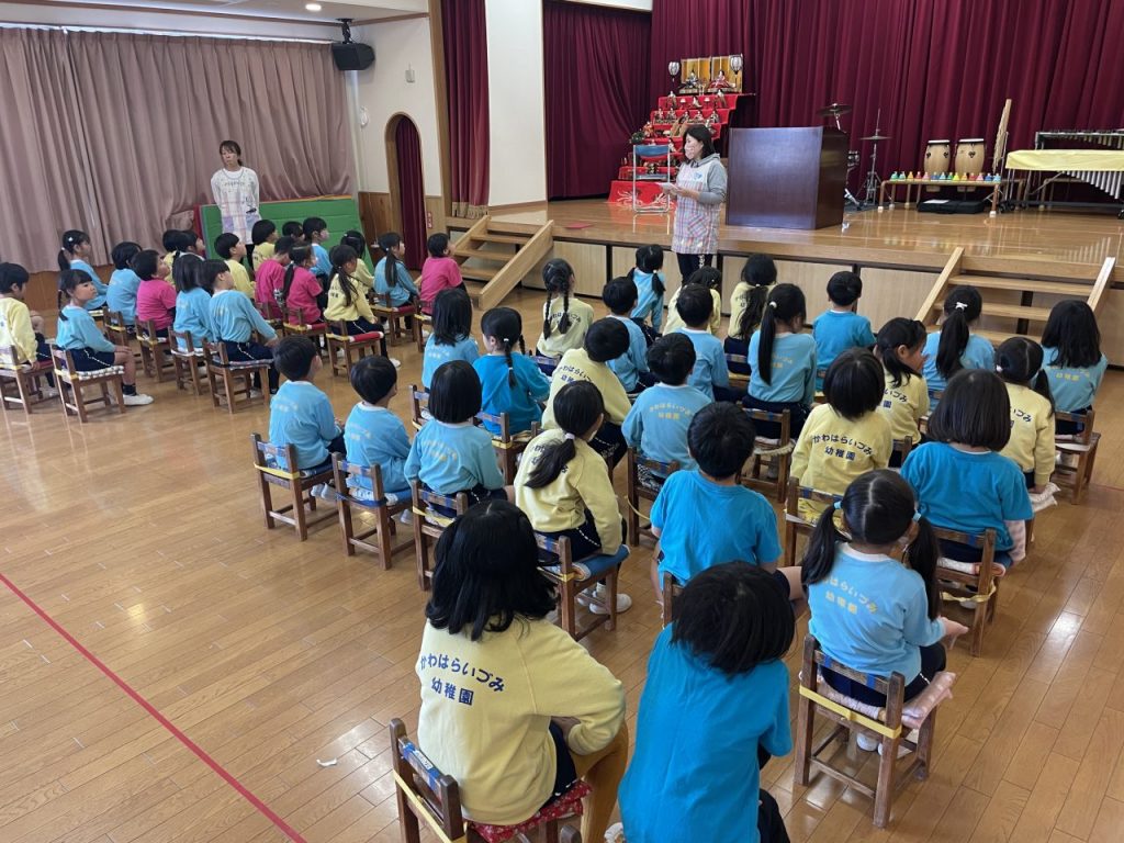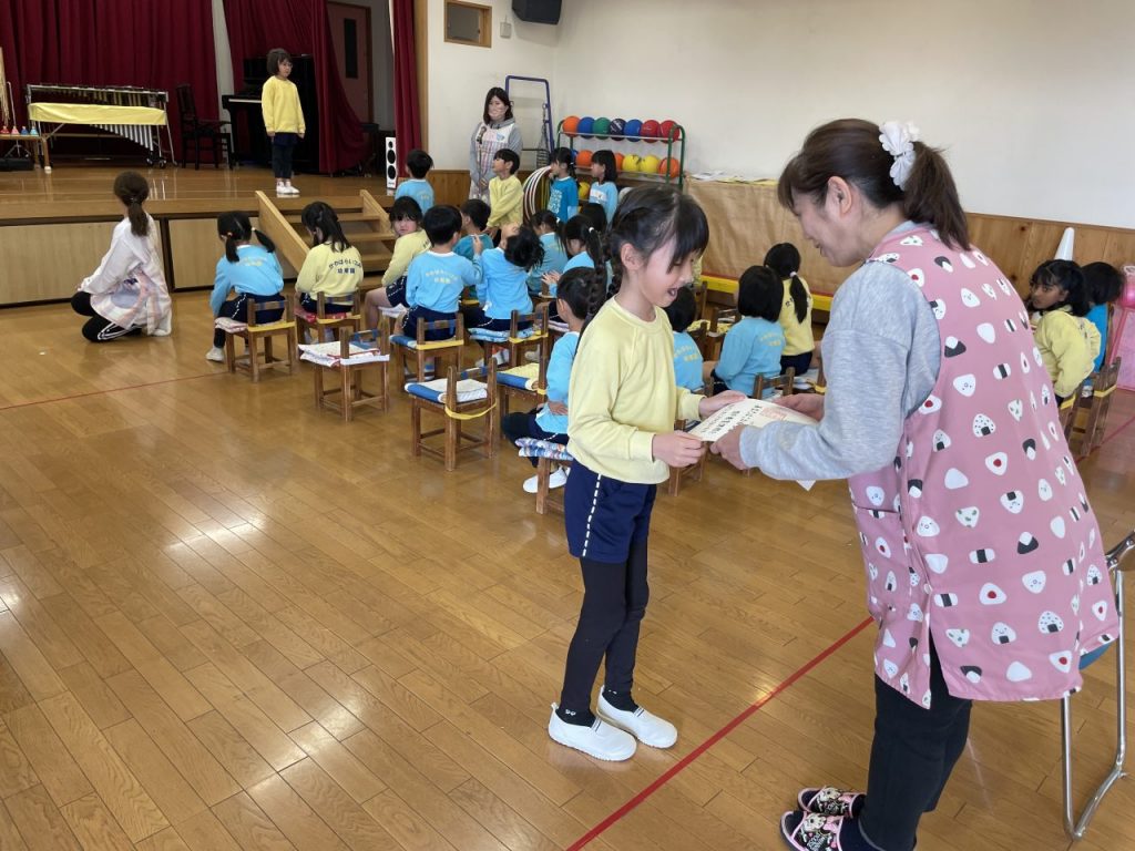 ホールに入るところから真剣な表情の子どもたち。座り方や立ち方など、参加の仕方を自分たちで意識できるようになってきました。♪ドキドキドン1年生や♪さよならぼくたちの幼稚園は、優しい歌声で歌詞を間違えないように…と丁寧に歌えましたね。 ひな祭りお楽しみ会 年長さんありがとう
