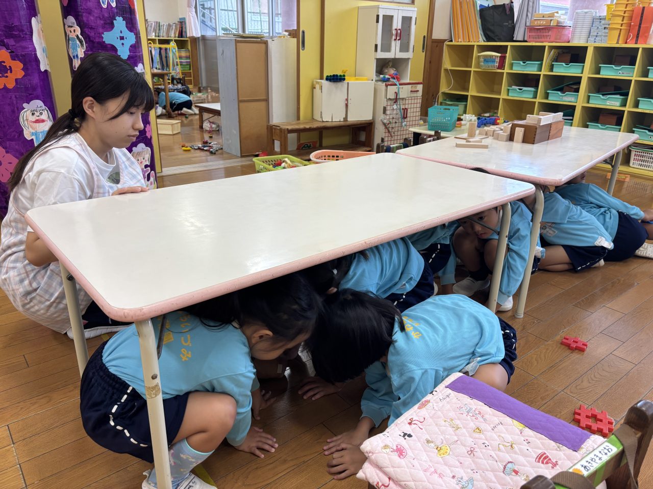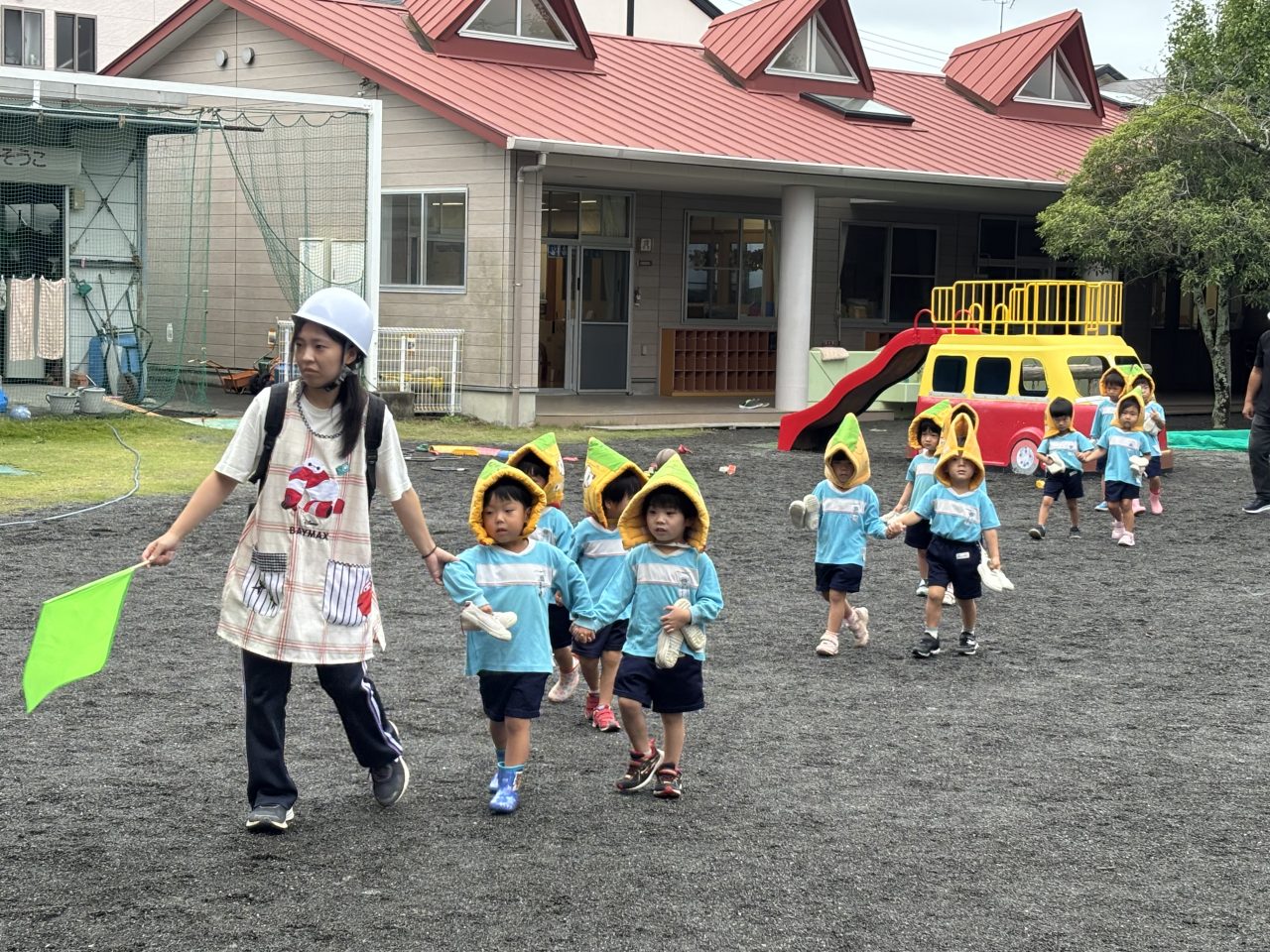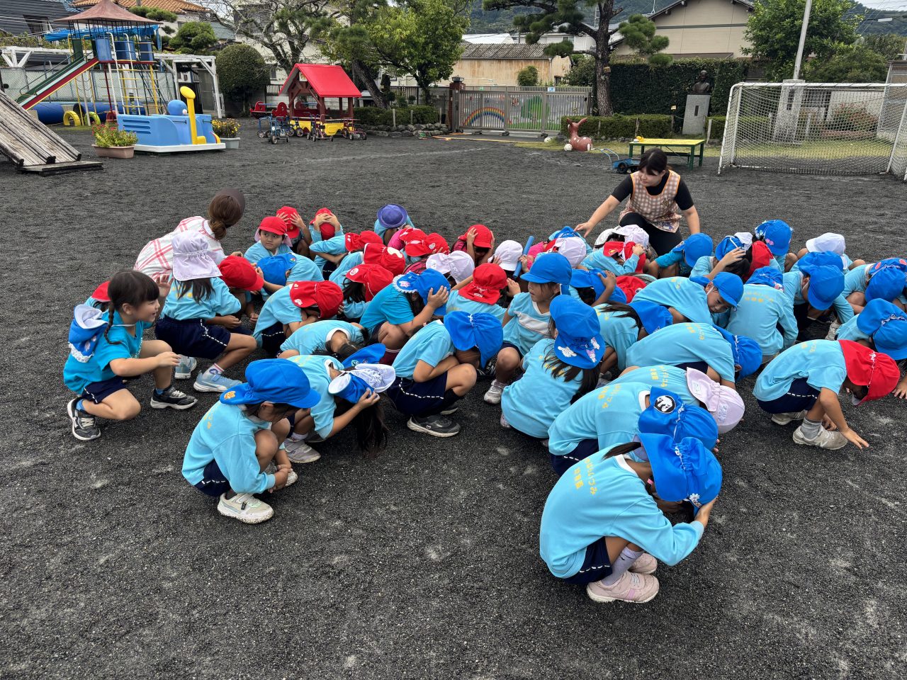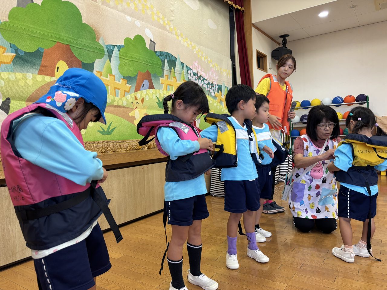 本園では定期的に避難訓練を実施し、津波が来たらどうするのかを子どもたちと確認しました。先生の話をよく聞く、園庭の真ん中に集まる、かえるポーズで身を守るなどしっかりお約束を覚えていました。バス通園児は救命胴衣着用の練習もして、いざと言う時に備えます。
