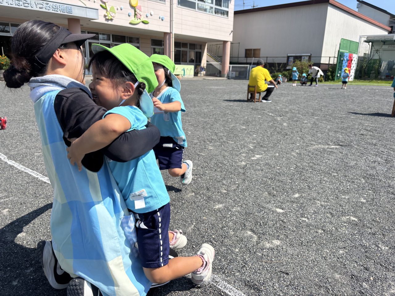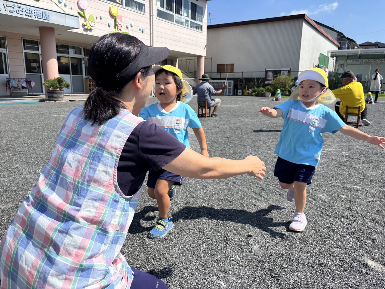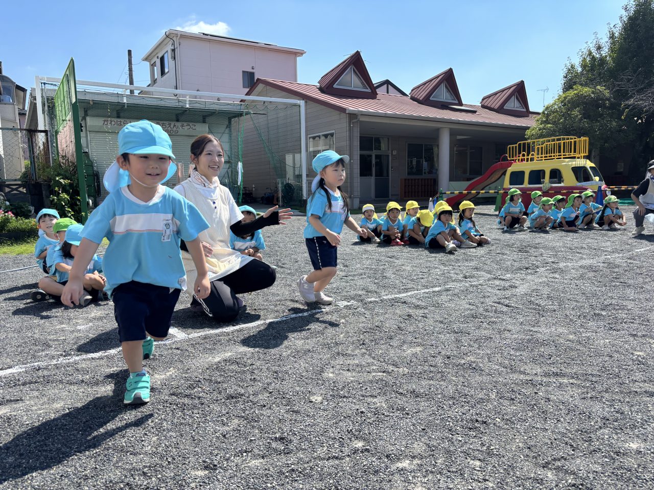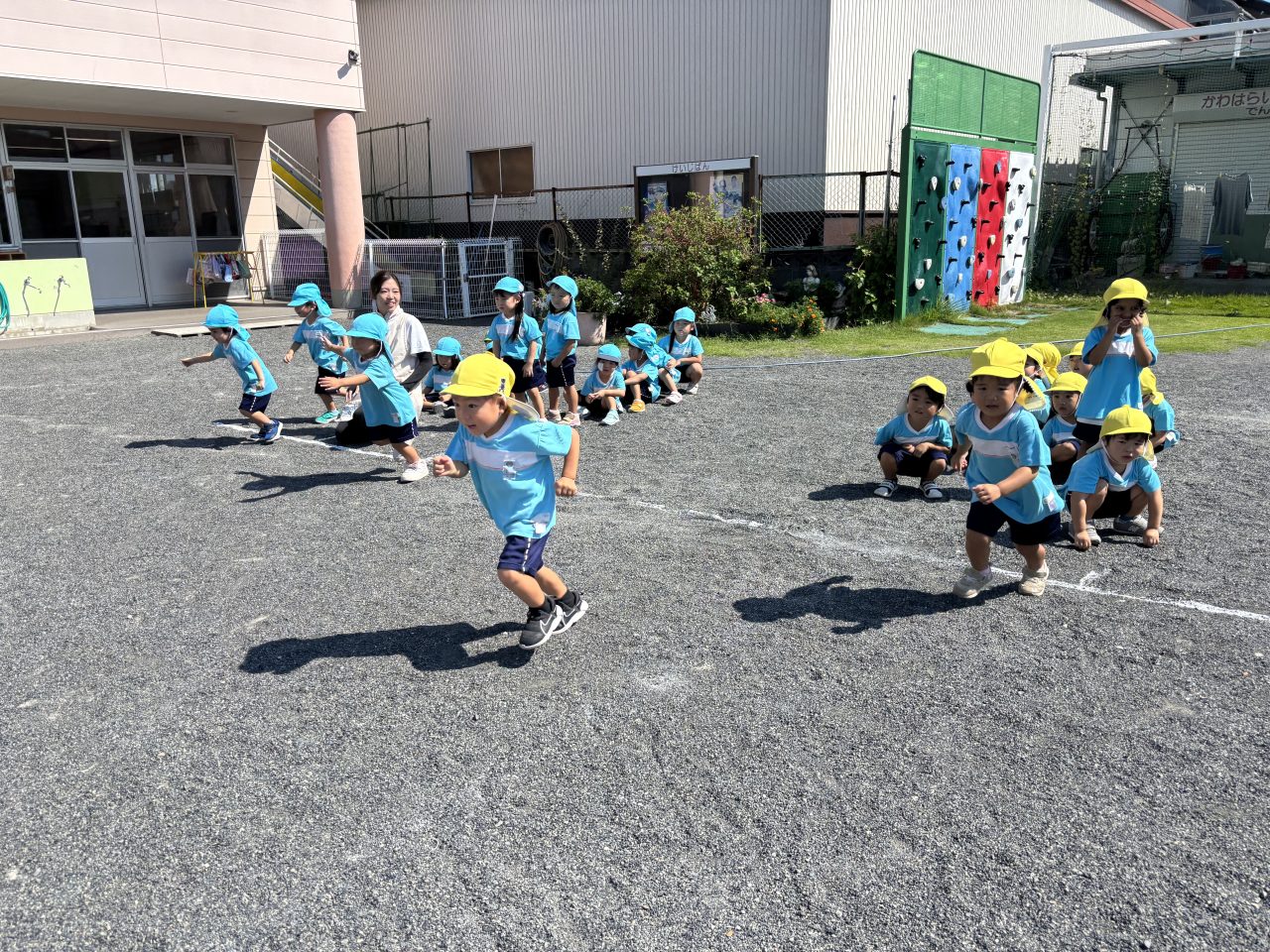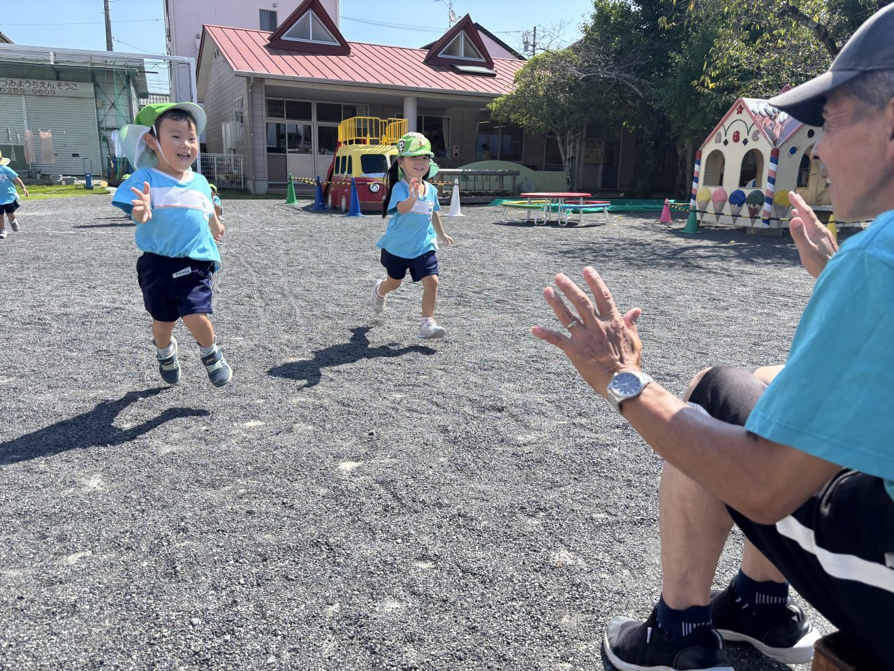 年少さんはヨーイドンの練習を繰り返すうちに、走るフォームがかっこよくなり直線ダッシュが上手になりました。保育室では、運動会で披露する遊戯の練習が進んでいます。運動会の招待状を、お家の人に渡すのが楽しみです。 Animal Words ありがとうプール