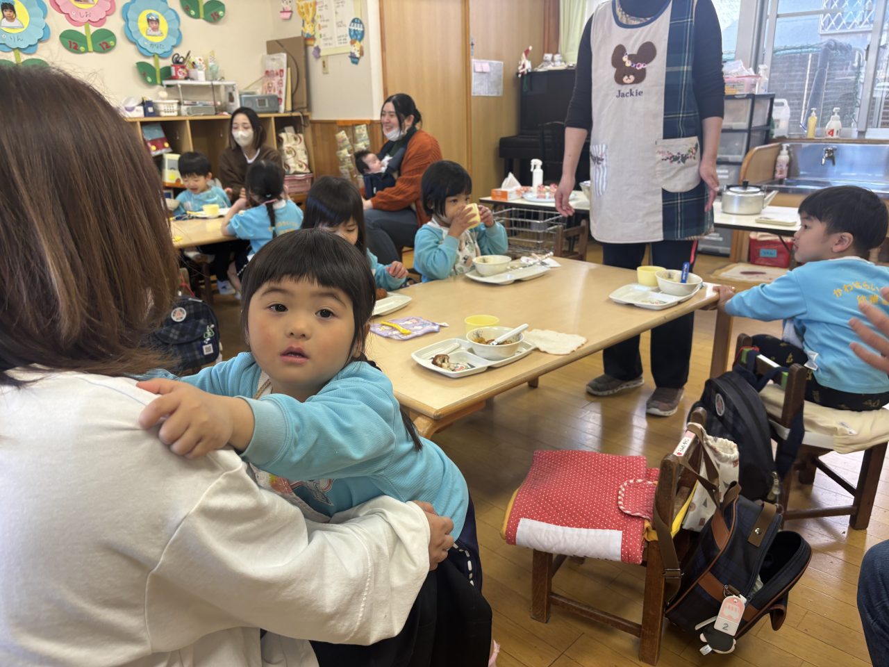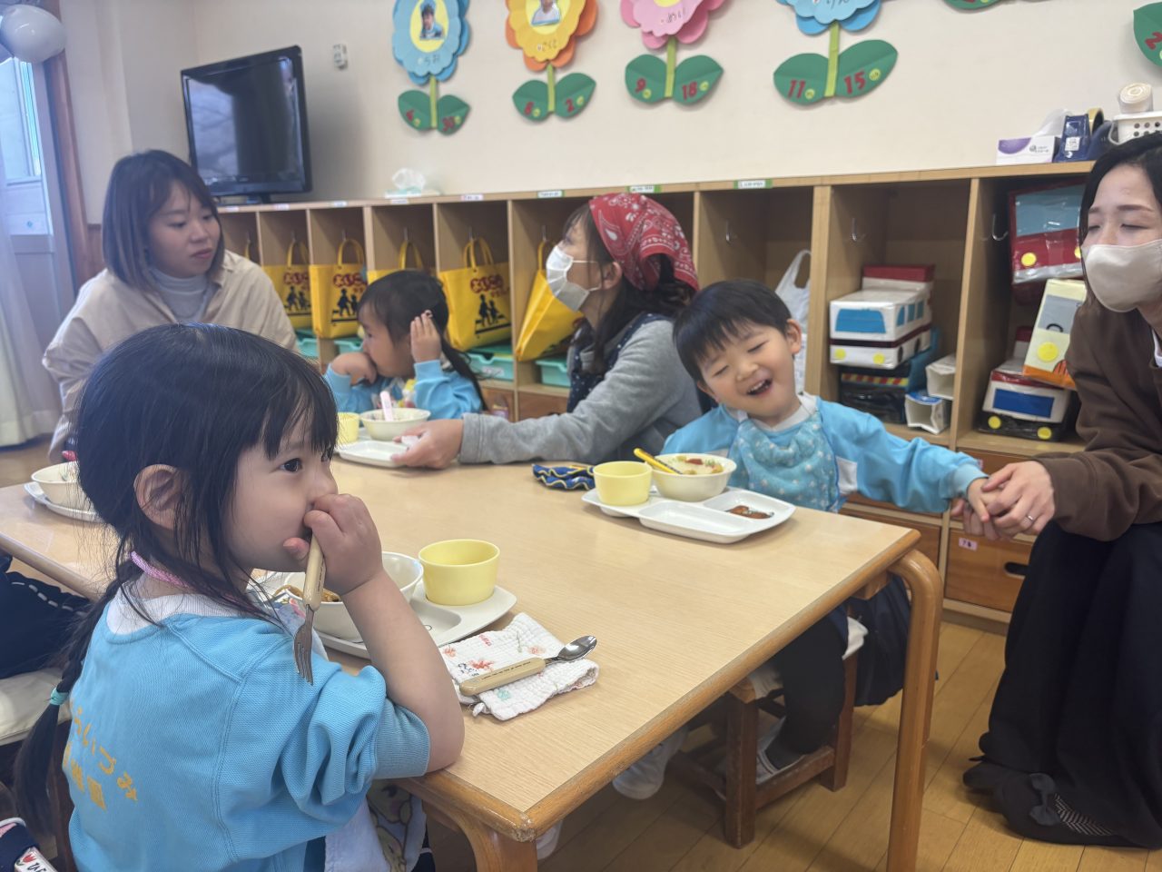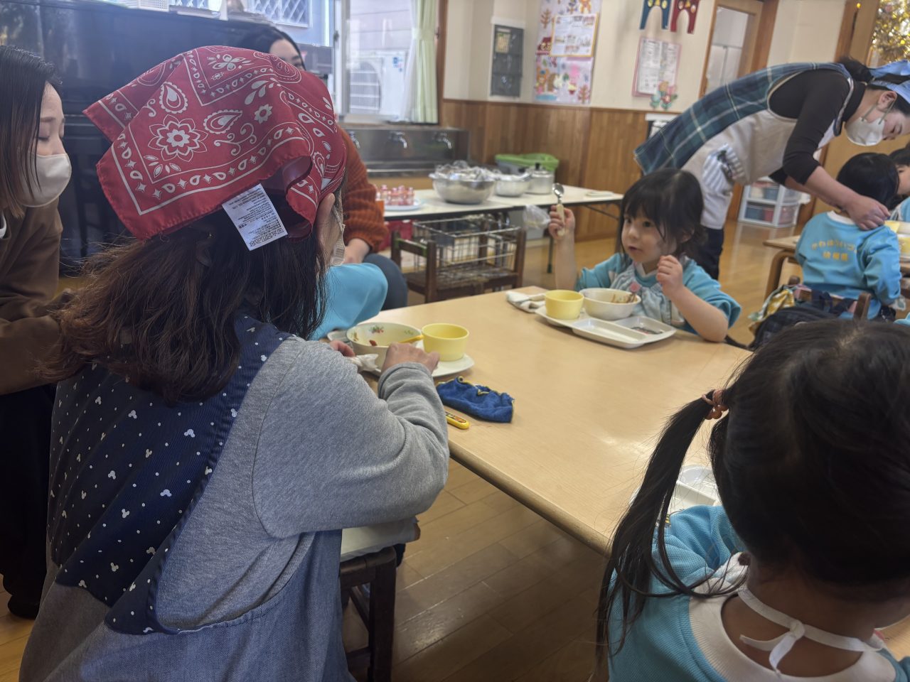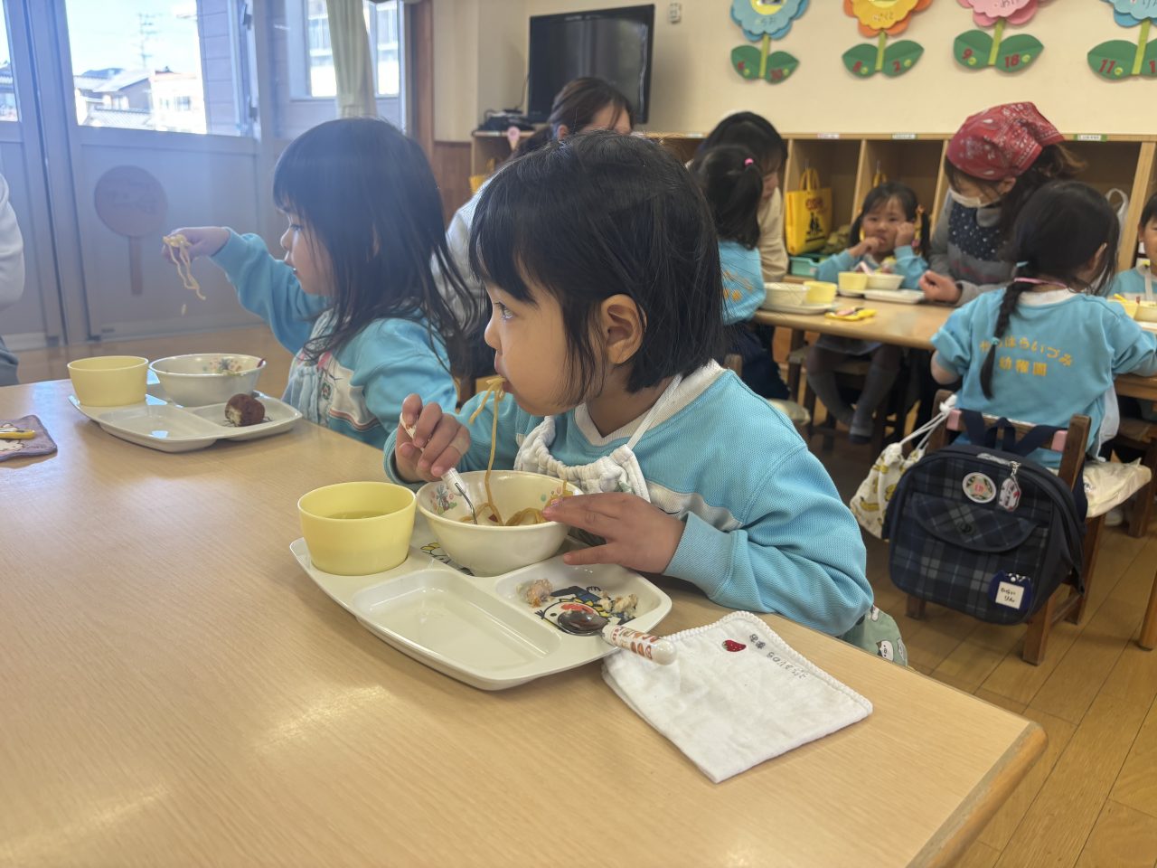 満3歳児クラスりす組は、給食の様子をお家の方に見てもらいました。上手に食べれるかな…どのぐらいの量を食べているのかな。おうちの人がいると甘えちゃうけど、最後はしっかり自分で食べることができました。モリモリ食べて完食です! お福さん わくわくプログラム