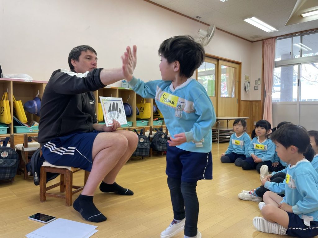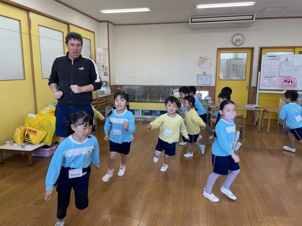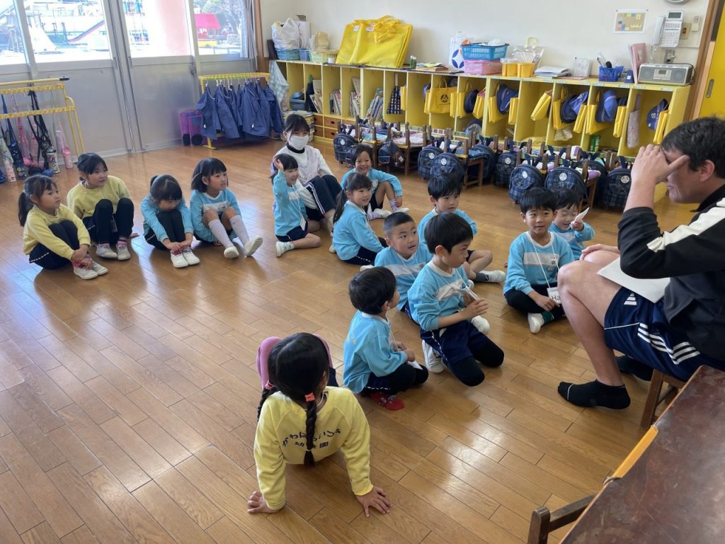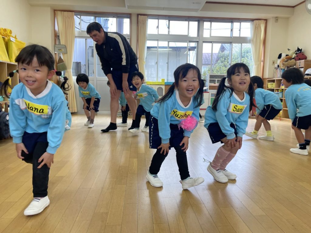 今年度最後の英語あそび。これまで習った手遊びや単語を振り返り、最後にみんなが大好きなベイビーシャークを楽しみました。年少でも色の単語を覚え始め、張り切って発表する姿があり、年中でのレッスンも楽しみにしているようです。 園庭あそび