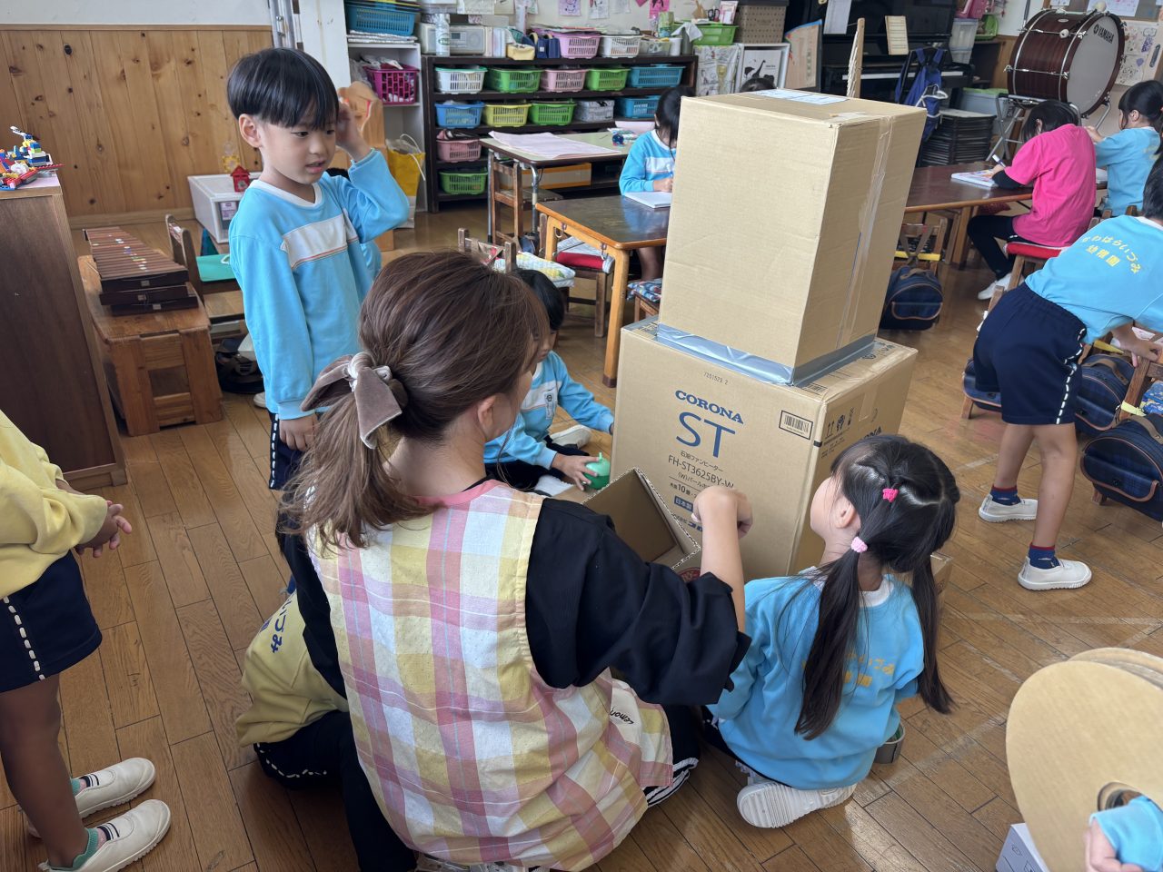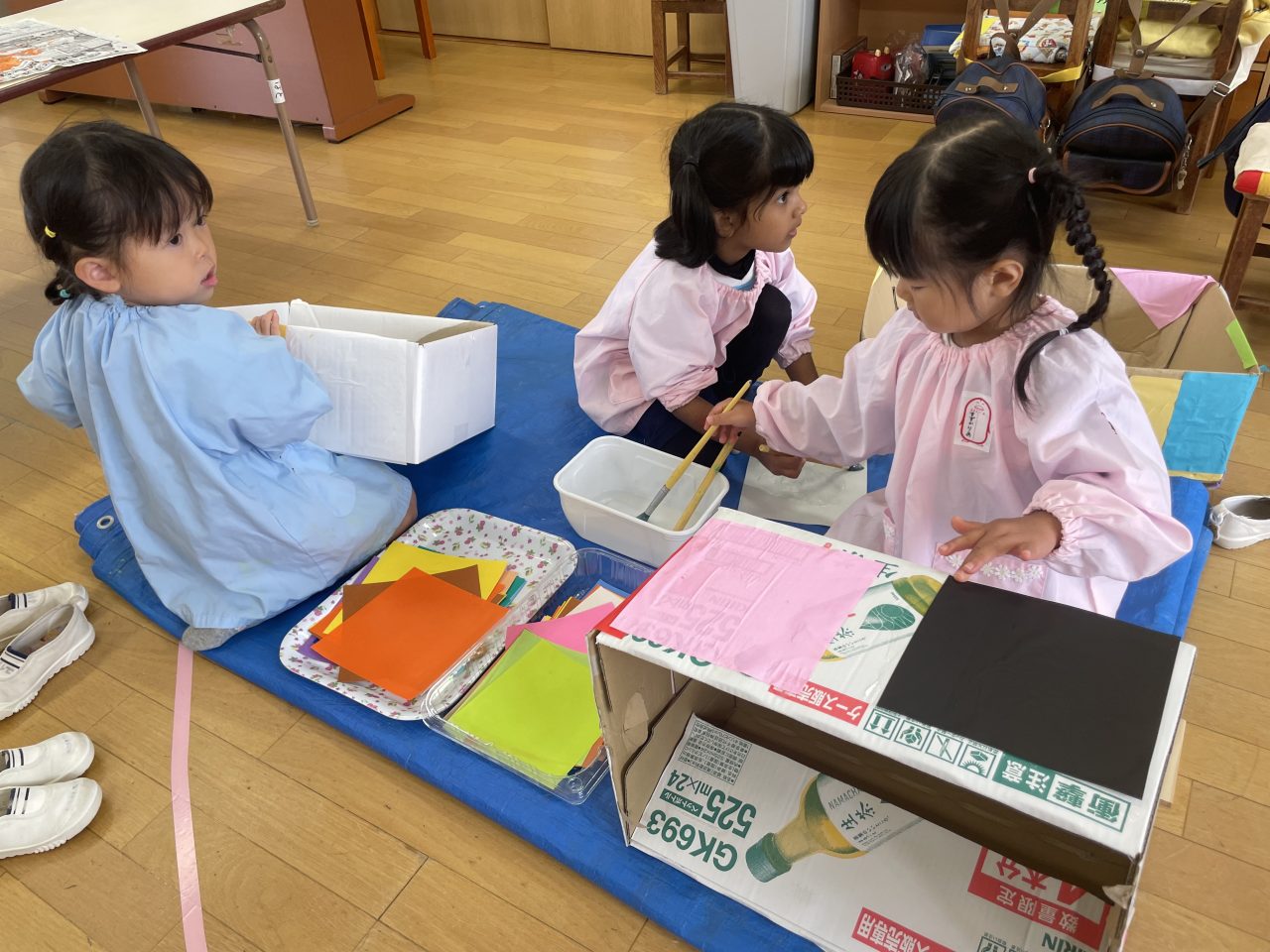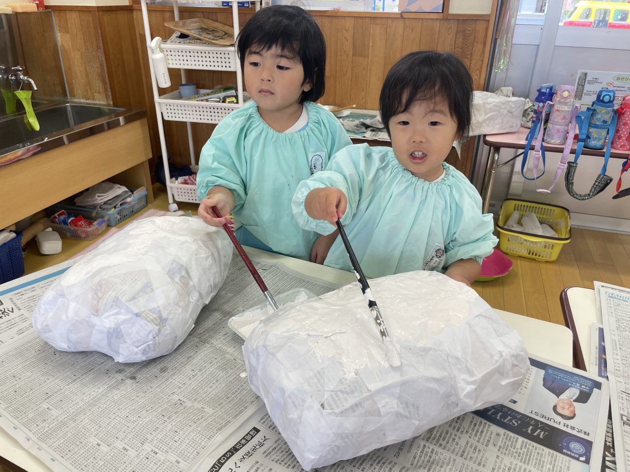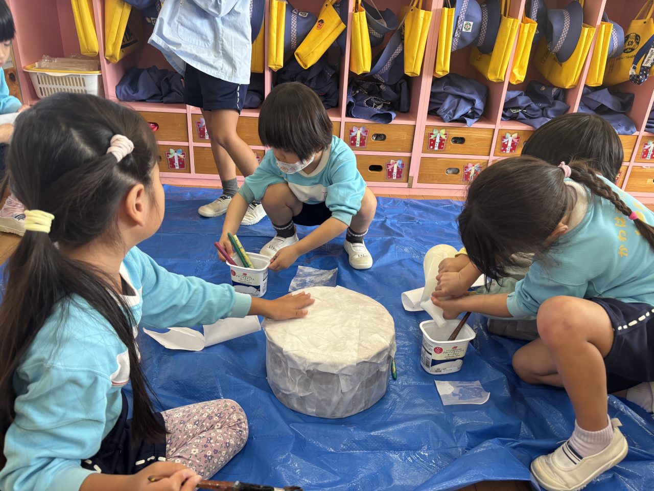 発表会に必要なものを子どもたちと相談しながら作っていき、それと同時に、衣装や帽子、身につける物の準備も進めていきます。段ボールや新聞紙を組み合わせて形にし、絵の具で色を塗ったり、折り紙を貼ったり…クラスみんなでイメージを共有させていきます。 楽器あそび ベビー&トドラー