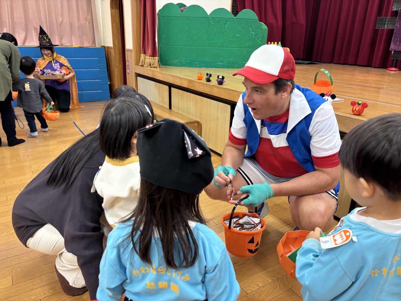 いづみっ子ひろばハロウィンパーティーでは、鳴き声クイズやビンゴゲームを楽しみました。ロブ先生の今年のコスチュームは、ポケモンのアッシュ!“trick or treat” と言ってお兄さんお姉さんが作ったマカロンやカップケーキをたくさんゲットしましたね。