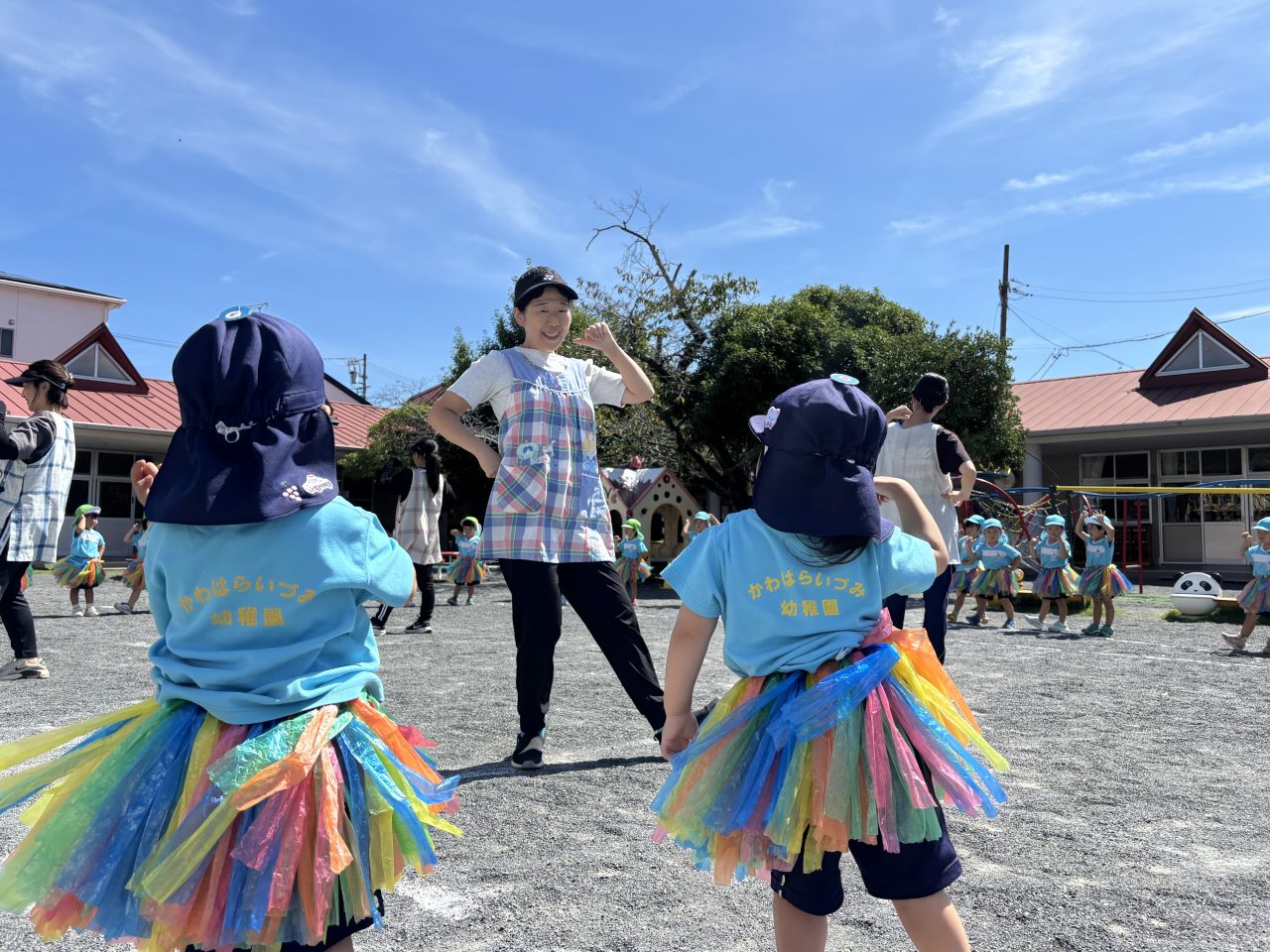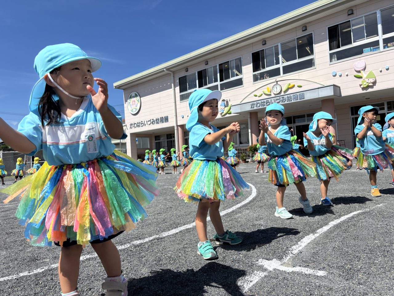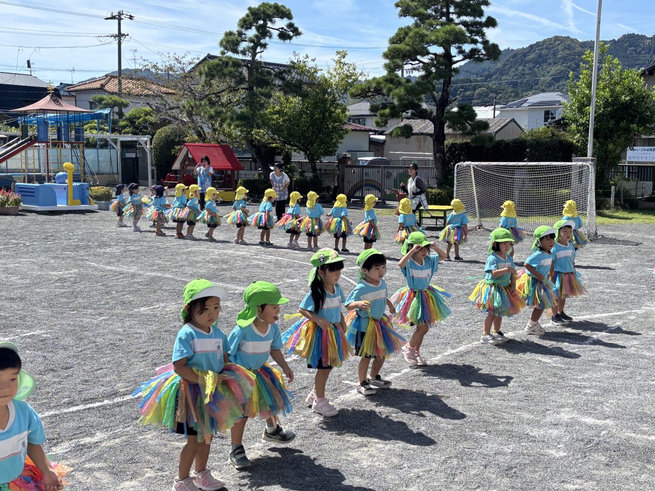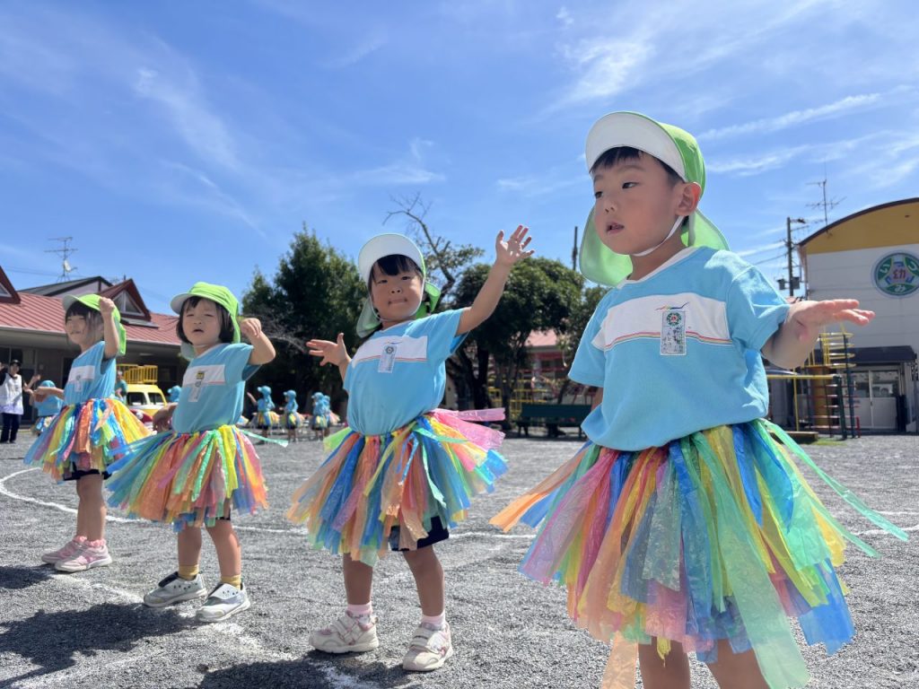年少・満三歳児は運動会で、ゆずが歌う(クレヨンしんちゃん映画のテーマソング)に合わせて素敵な踊りを披露してくれます。鮮やかなフリフリの衣装が陽気なメロディーとマッチして、運動会を盛り上げてくれることでしょう…先生の踊りを見つめて真似しようとする姿は、とても可愛らしいです。