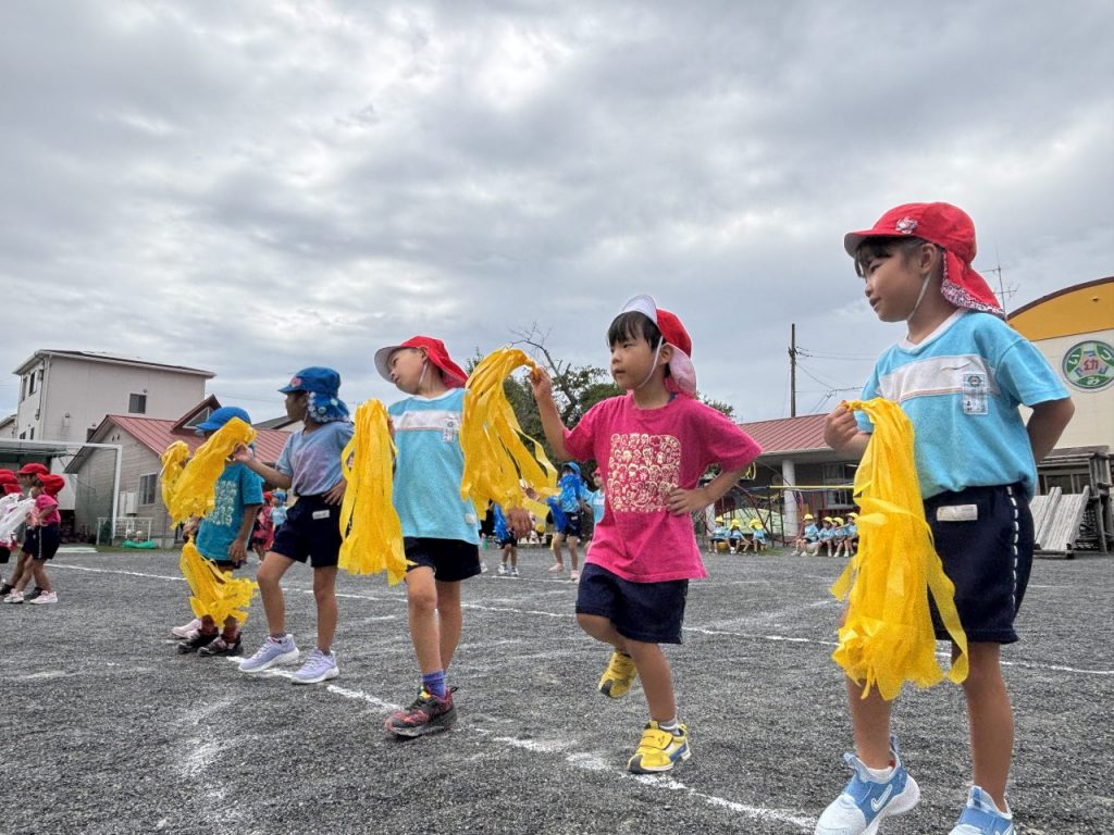 運動会の幕開けは、年長児による入場行進。自分の好きな色を選び、7つのチームに分かれて運動会を華やかに彩ります。手具のフサフサを風になびかせながら、みんなでタイミングを合わせ全身で表現しましょう!おうちの人に見てもらうのが楽しみです -