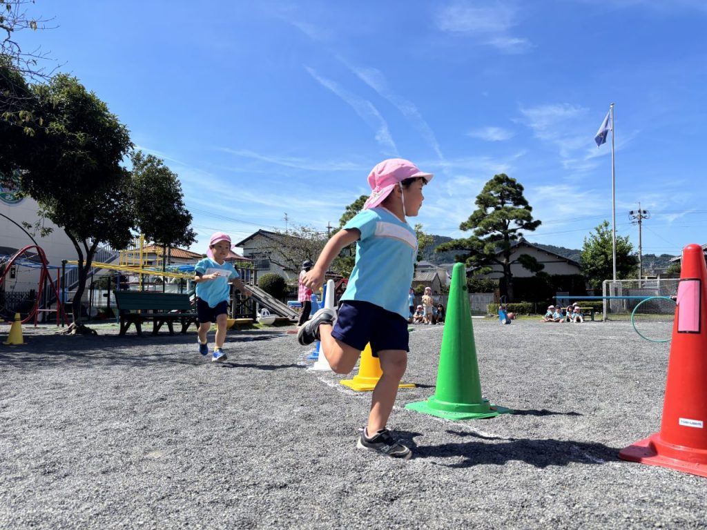 年少さんはヨーイドンの練習を繰り返すうちに、走るフォームがかっこよくなり直線ダッシュが上手になりました。保育室では、運動会で披露する遊戯の練習が進んでいます。運動会の招待状を、お家の人に渡すのが楽しみです。 -