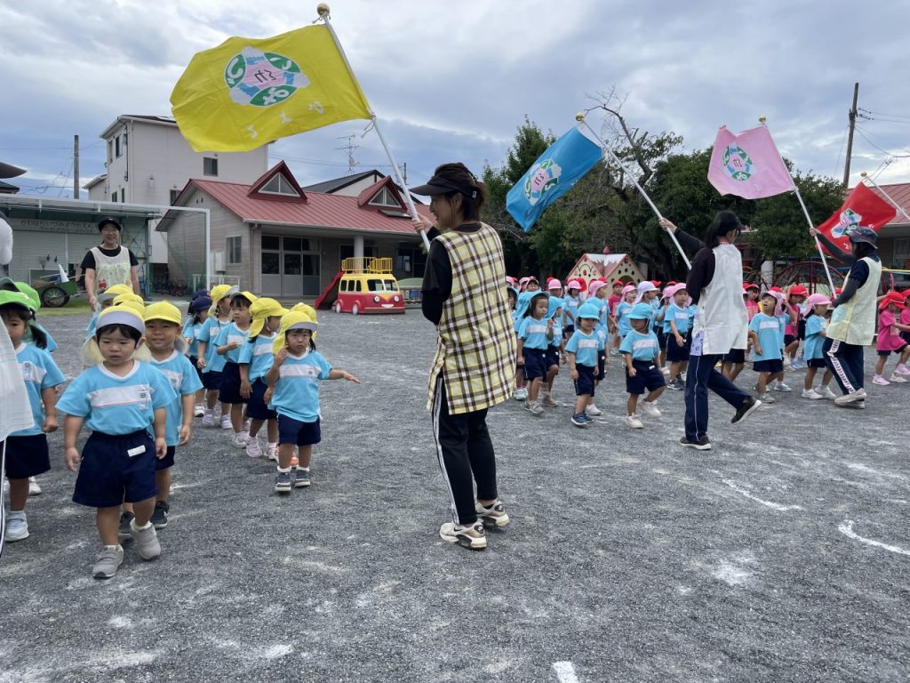 運動会の始まりは、先生たちがクラスカラーの旗を持ち、その後ろを子どもたちが元気に行進します。手と足を思いきり振って、いちに、いちに!おひさまパワーに負けないよう、元気に準備体操をしましょう。満3歳児クラスのお友達も頑張っていますね。 -
