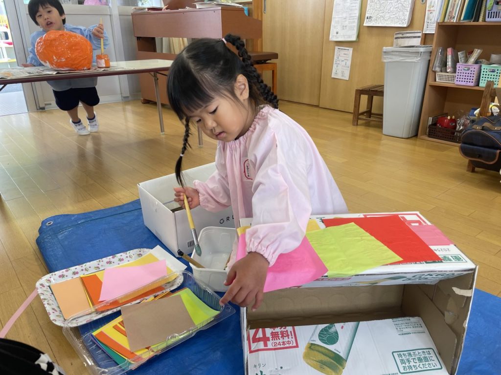 発表会に必要なものを子どもたちと相談しながら作っていき、それと同時に、衣装や帽子、身につける物の準備も進めていきます。段ボールや新聞紙を組み合わせて形にし、絵の具で色を塗ったり、折り紙を貼ったり…クラスみんなでイメージを共有させていきます。 -