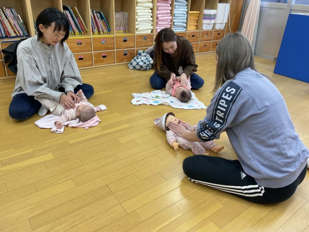 講師の先生をお招きし、赤ちゃんのための発達や栄養のお話、マッサージを含む赤ちゃんへの接し方などを教えていただきました。意識しなければ気づかないアドバイスもたくさん!次回は運動遊びも楽しませていただく予定です。 -