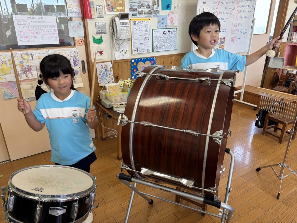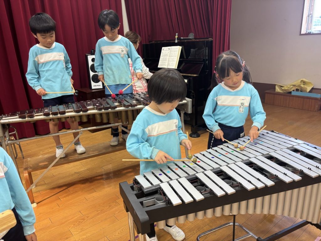 年長は、生活発表会で披露する合奏の練習中です。それぞれやりたい楽器を決めて挑戦!みんなでタイミングやリズムを合わせ、メロディーを奏でるのは難しいけれど、少しずつ揃ってくると気持ちがいいです♩周りの音を聴きながら演奏しようね。 -