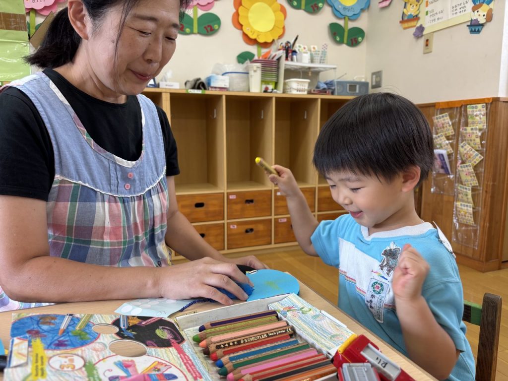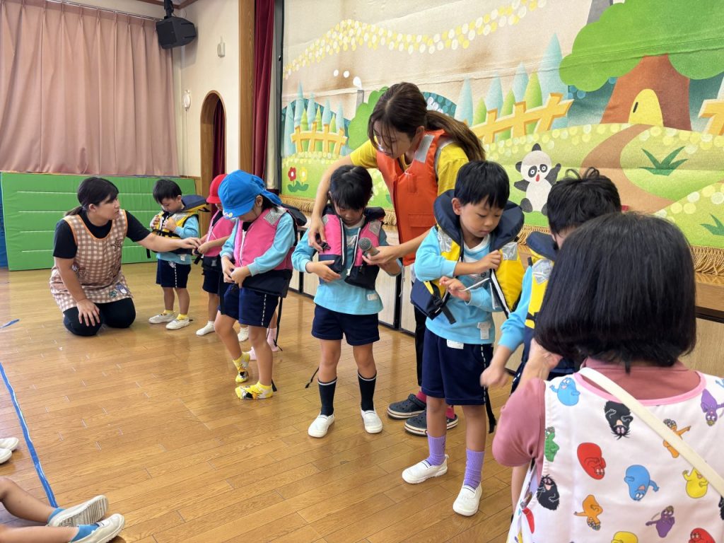 本園では定期的に避難訓練を実施し、津波が来たらどうするのかを子どもたちと確認しました。先生の話をよく聞く、園庭の真ん中に集まる、かえるポーズで身を守るなどしっかりお約束を覚えていました。バス通園児は救命胴衣着用の練習もして、いざと言う時... -